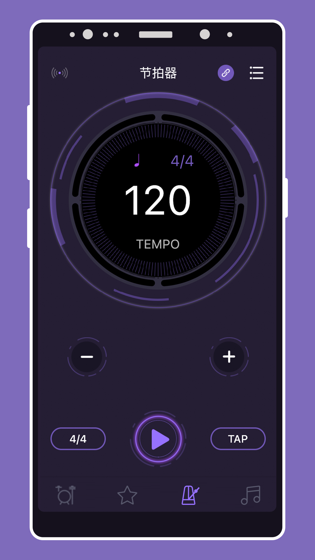 节拍器模块:超大且明显的节拍滚轮盘,满足您的快速调节的需要,并配合丰富且全面的节拍音符类型,和五种不同的节拍器音色选择,让您的听、学、打一气呵成。