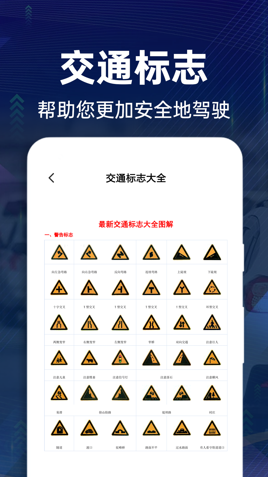 用户在此处能够查询到各类交通标志的含义和用途,包括禁令标志、警告标志、指示标志等。这些交通标志是驾驶必须掌握的基本知识,掌握它们能帮助用户更好地理解并遵守交通规则,保障自身和他人的安全。