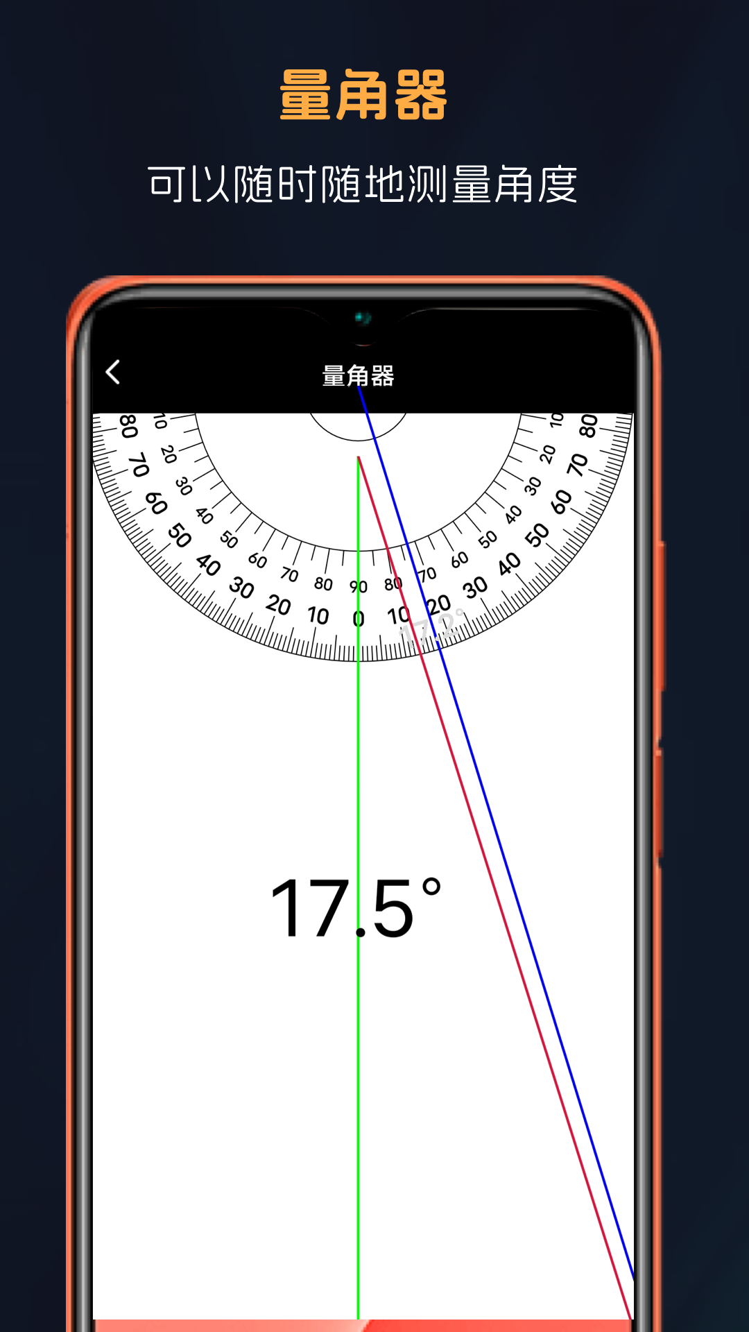 在测量方面,它具备多种实用功能:其中量角器功能可通过触摸来测量物体的角度;刻度尺功能能够满足日常生活中的长度测量需求;指南针功能不仅能帮助您辨别方向,还可以查看经纬度;水平仪功能可用于显示在水平面上的水平位置情况。此外,该软件还具有测温功能。