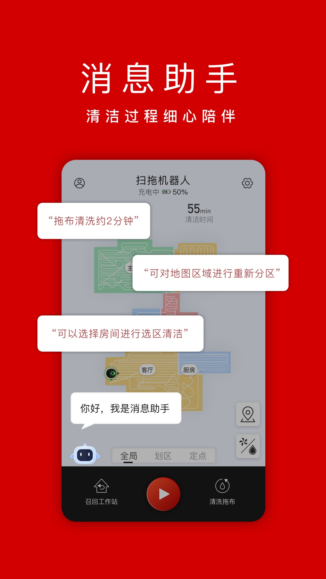 支持通过选区、划区、定点等多种方式进行清洁,您指向哪里,它就清洁哪里,必定完成任务。
