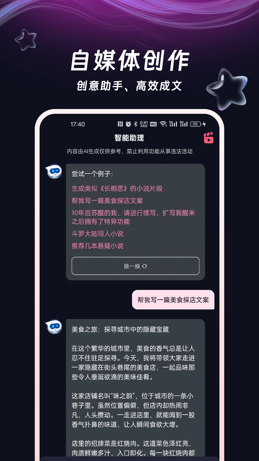 在内容创作方面,视频鸭也毫不逊色。它能满足小说续写、短视频文案创作、脚本撰写等需求,并且创作风格还能根据用户的要求而定。
