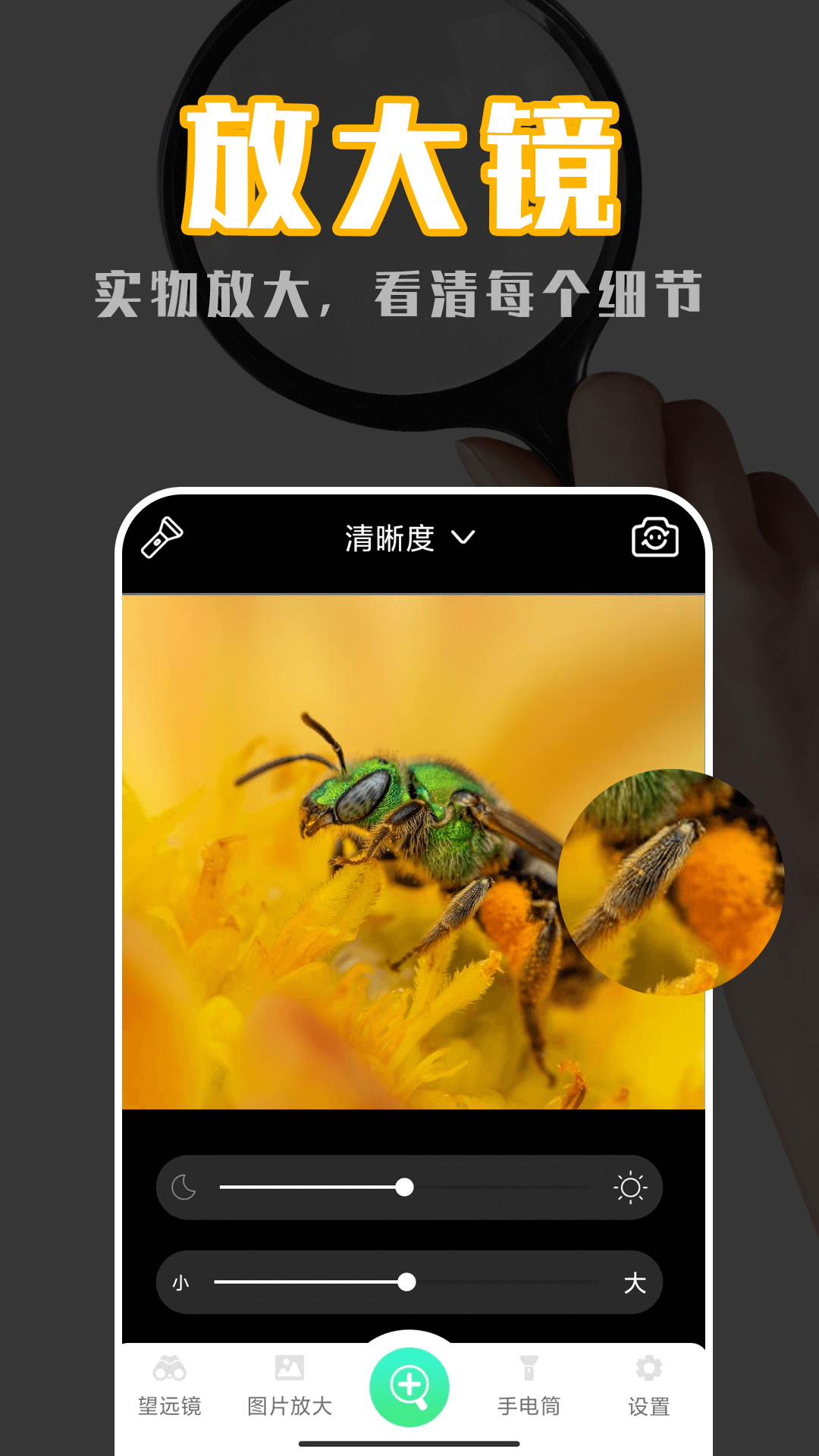 这是一款老年AR放大镜,同时也是手机高清夜视3D望远镜,并且是能够高倍识别文字、放大图片的阅读器,它是根据生活需求而设计的免费工具。