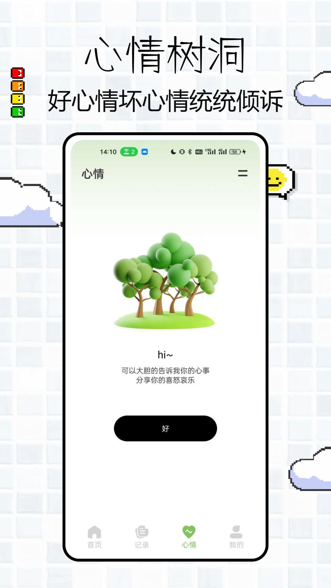 【心情】悟饭时光为您提供了一个树洞功能。这里,您可以倾诉心声,把想说的话全部倾述给树洞。无论喜怒哀乐,树洞都会默默倾听,让您的心灵得到慰藉。