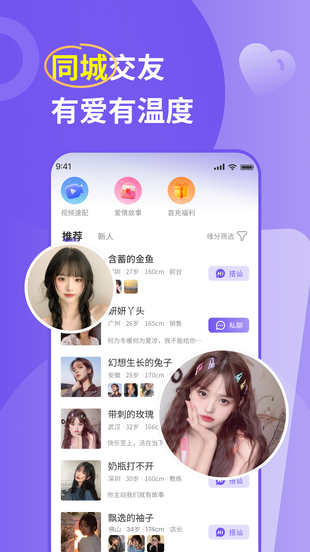 “同城伴聊”是一款全新的社交软件:简单、真实、随缘、充满心动、充满惊喜~点开“同城伴聊”,来一场美美的聊天交友邂逅之旅,快速找到适合你的TA!
