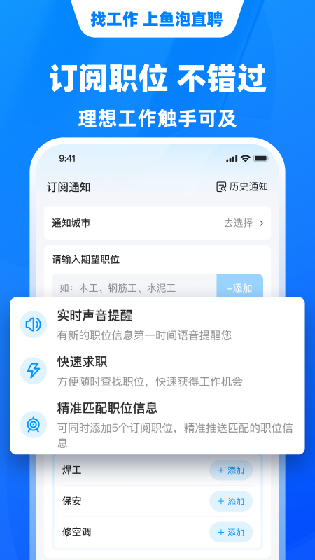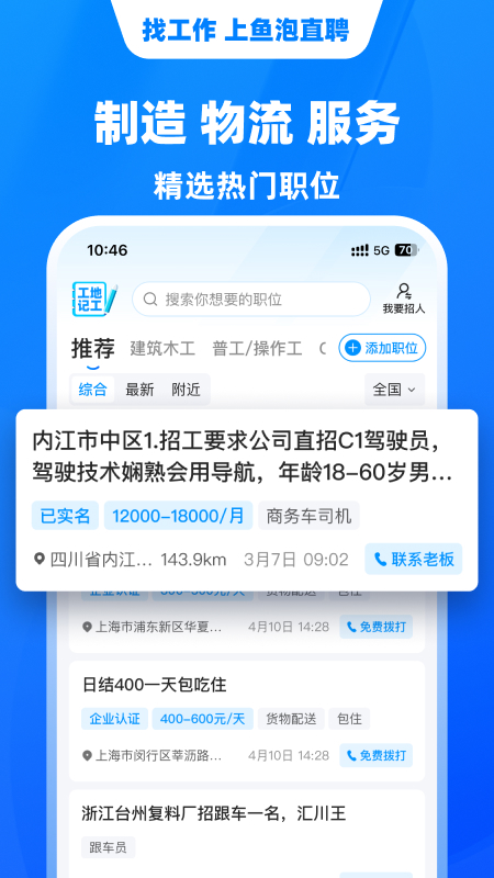 鱼泡网是国内领先的招聘求职找工作平台,为求职者提供海量2024年招聘职位,为企业提供心仪人才简历,覆盖建筑装修、工厂制造、物流运输、生活服务、机械司机、餐饮酒旅、人事行政、销售客服、农林牧等行业,服务全国600余座城市。每天上百万老板在线直招,上千万求职者在线找工作。