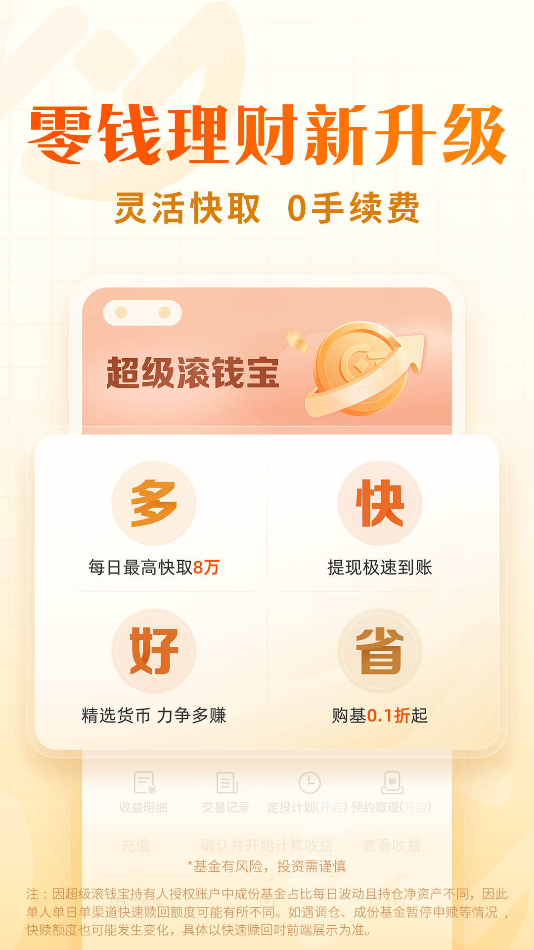 【活钱管理方面】超级滚钱宝,具有诸多优势,买卖无需手续费,每日最高快取额度可达5万,而且购买基金时最低可享0.1折优惠。