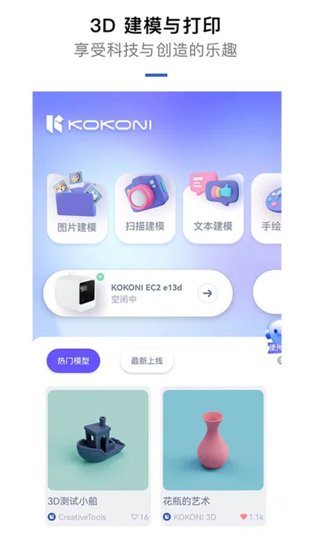 KOKONI 3D是一款即便零基础也能轻松上手的3D建模与打印控制应用,它就像是一个连接二维与三维世界的创造枢纽。当它与KOKONI 3D打印机设备相结合时,你就能尽情体验其完整功能所带来的无限乐趣。
