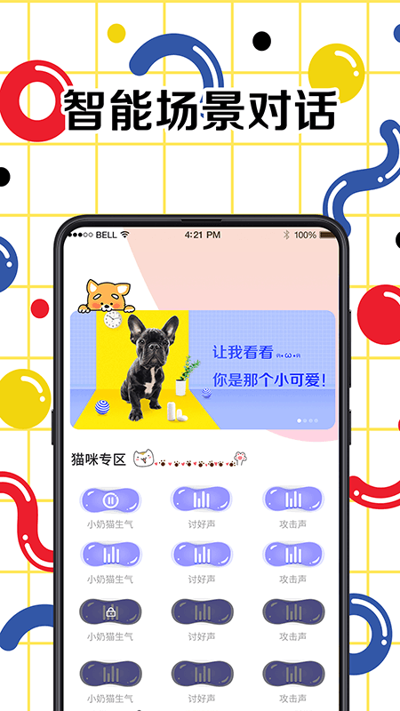它能即时把您的声音转换为猫语和狗语,从而吸引猫咪和狗狗的注意力,您再也不用发愁猫咪和狗狗不亲近您了。