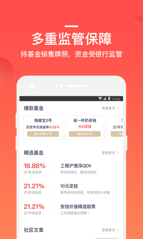 2. 挖财基金销售的基金产品受证监会监管,基金产品管理人受证监会监管,资金往来受监督银行监管,挖财基金不可触碰投资人资金。