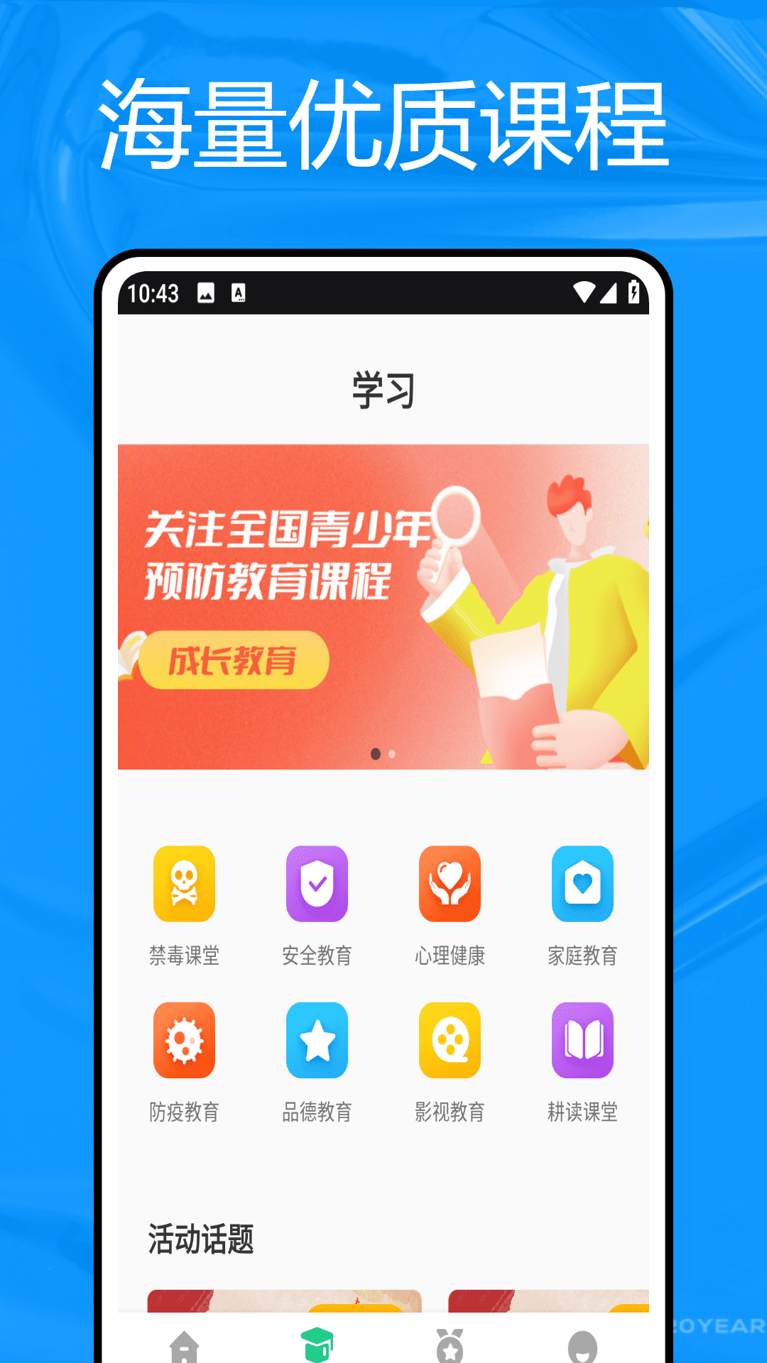 并且,学浪课堂在品德教育、家庭教育、研学教育、影视教育、防疫教育、心理健康教育、生命与安全教育、党史教育等多个领域,也提供了数量众多的学习课程。
