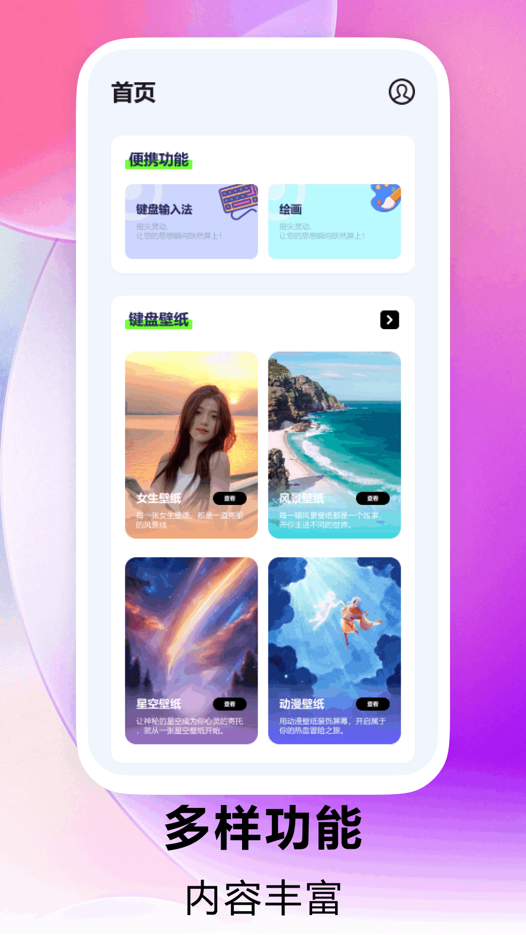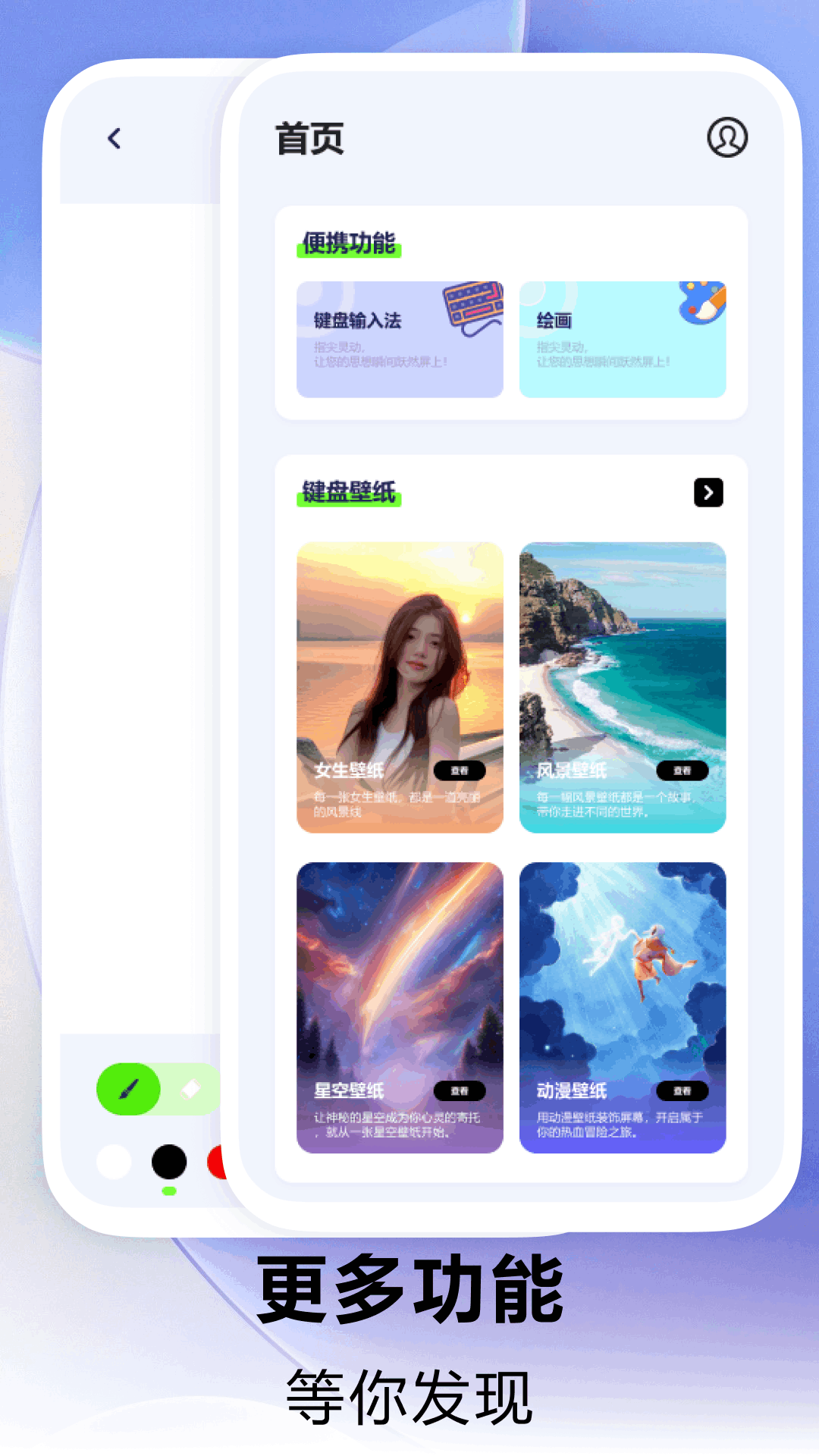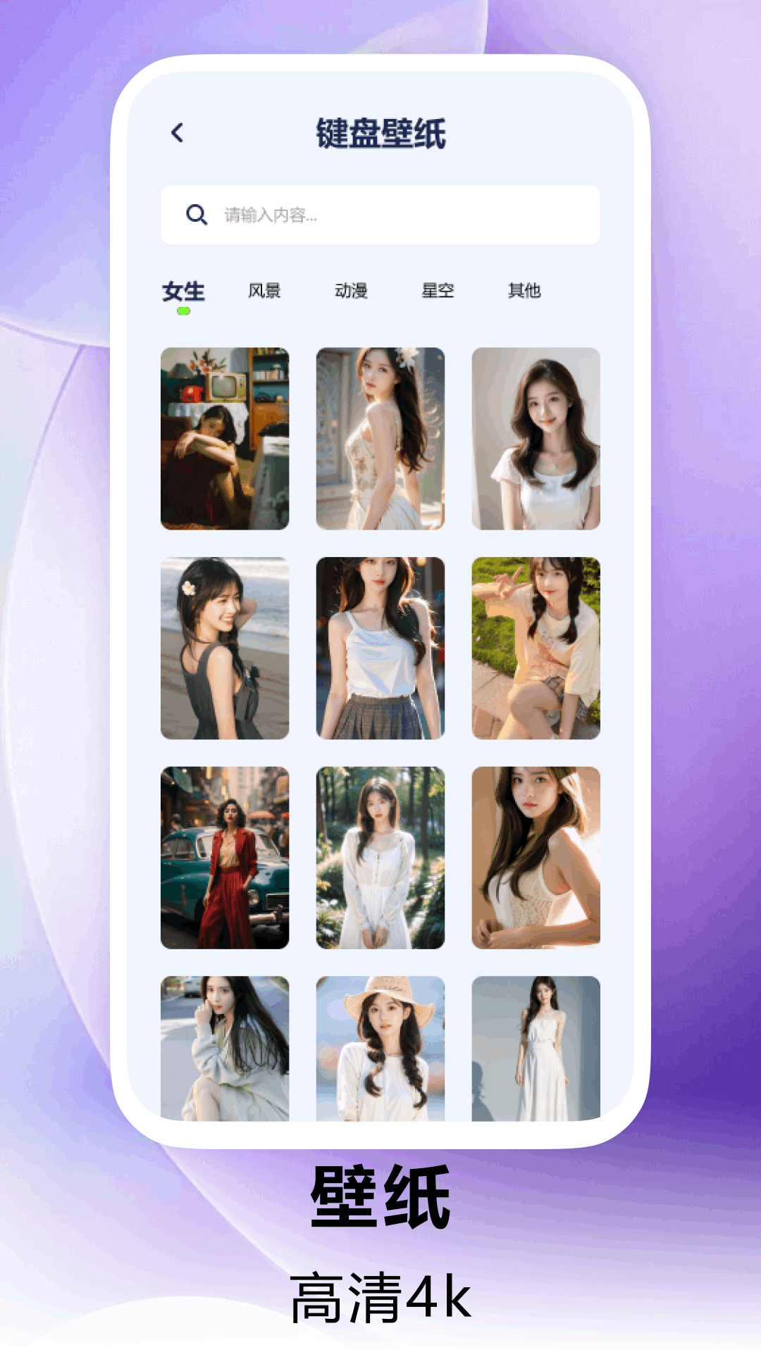 Love键盘:超高清无水印的壁纸美图等你来享!哪怕是全面屏手机,也能尽情体验无损的视觉盛宴,让你的手机桌面独具一格,瞬间在好友圈惊艳众人!这里有女生壁纸,展现各种女性的独特魅力;有风景壁纸,带你领略大自然的绝美风光;还有星空壁纸,让你仿佛置身浩瀚宇宙;更有动漫壁纸,满足动漫爱好者的喜好。此外,Love键盘还是一款实用的键盘输入法哦。
