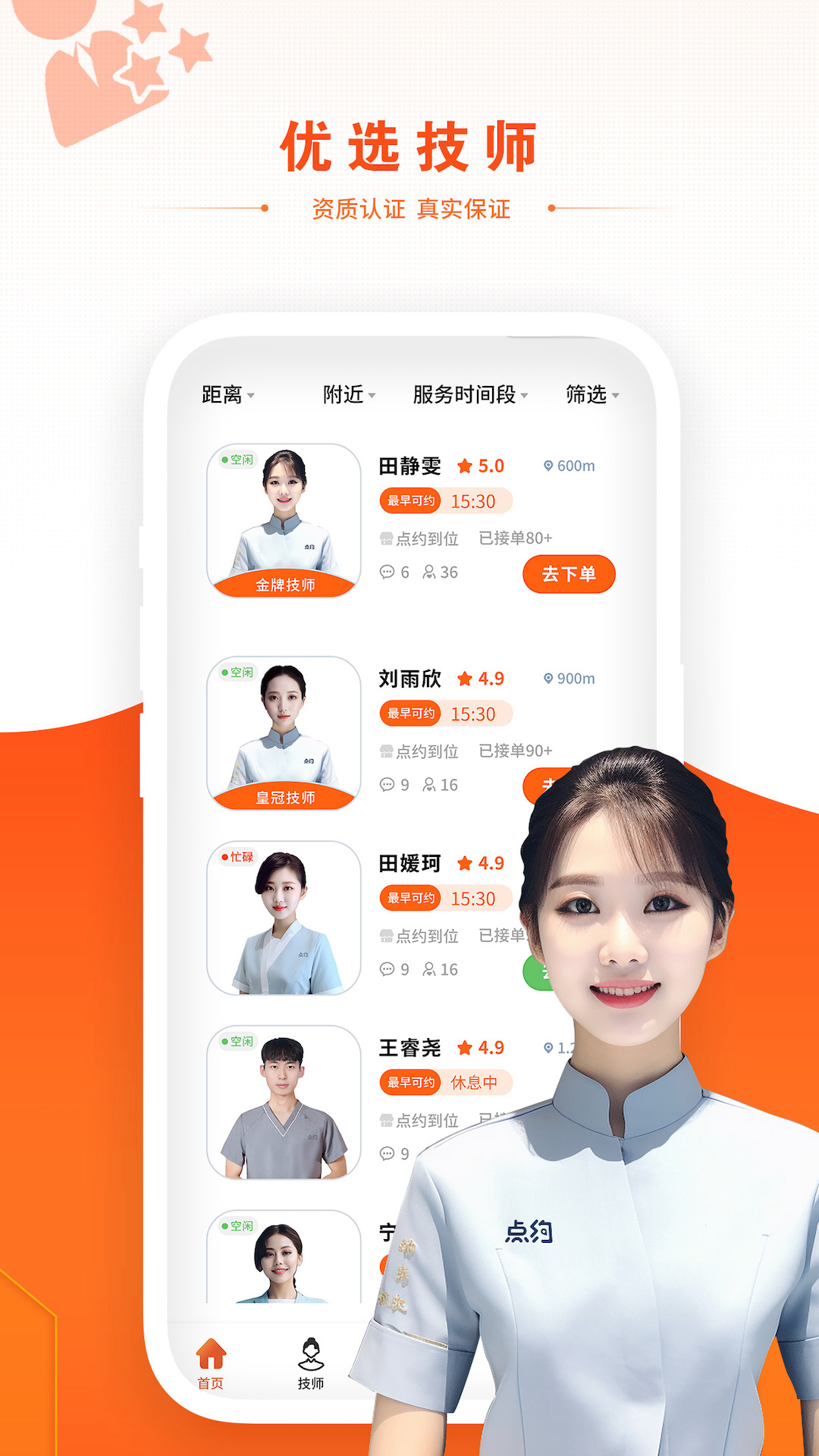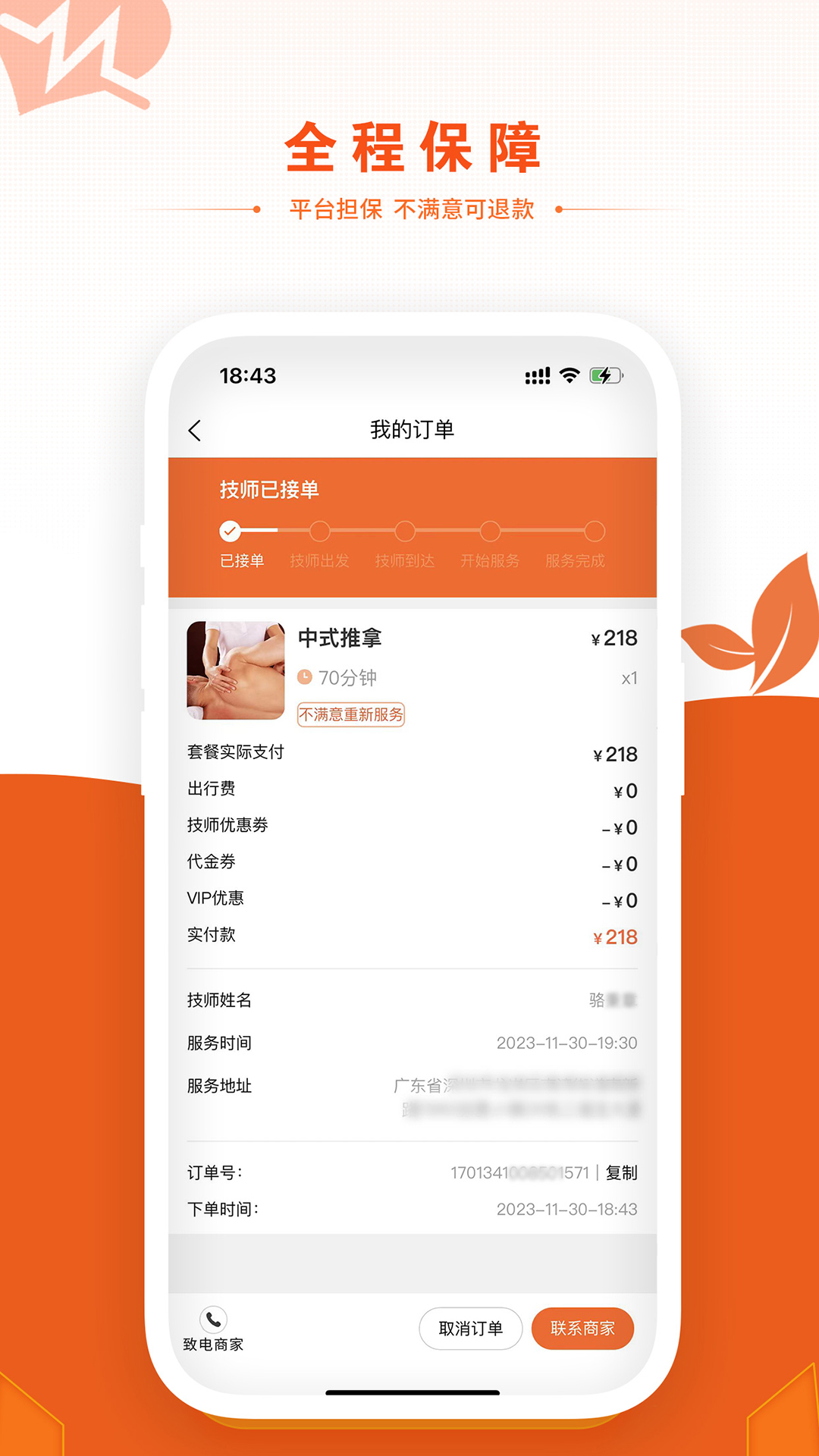 附近的技师和商家信息一目了然,能够实时查看技师到达的距离,轻松预约到家享受揉按舒缓服务。