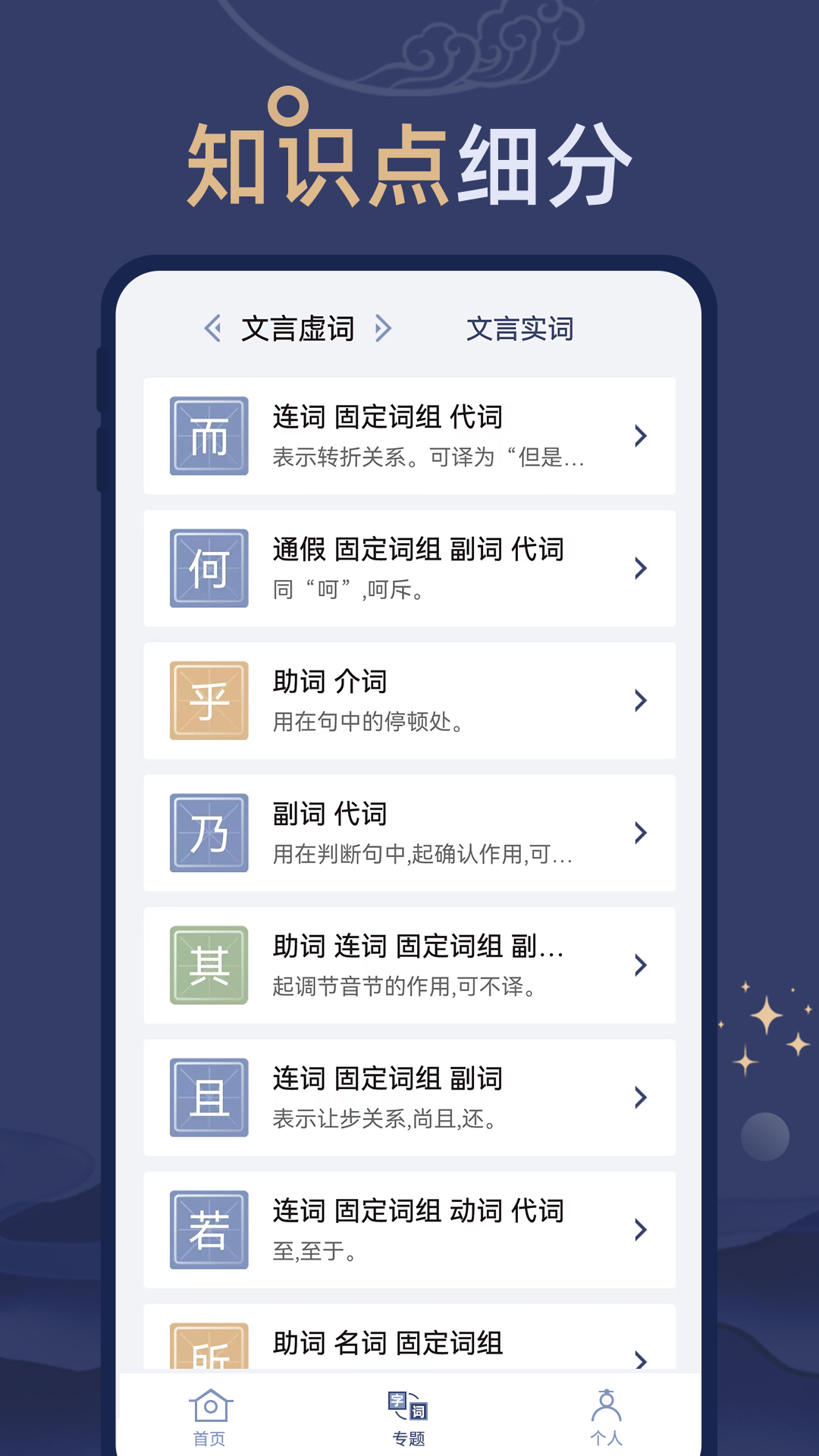 字词专题的设计更适合用户对常用虚词、实词更深入的了解,虚词和实词的详细解析以及对应例句的展示,便于用户熟练该内容,长期积累下来,必能对文言文阅读与翻译有不小的帮助。