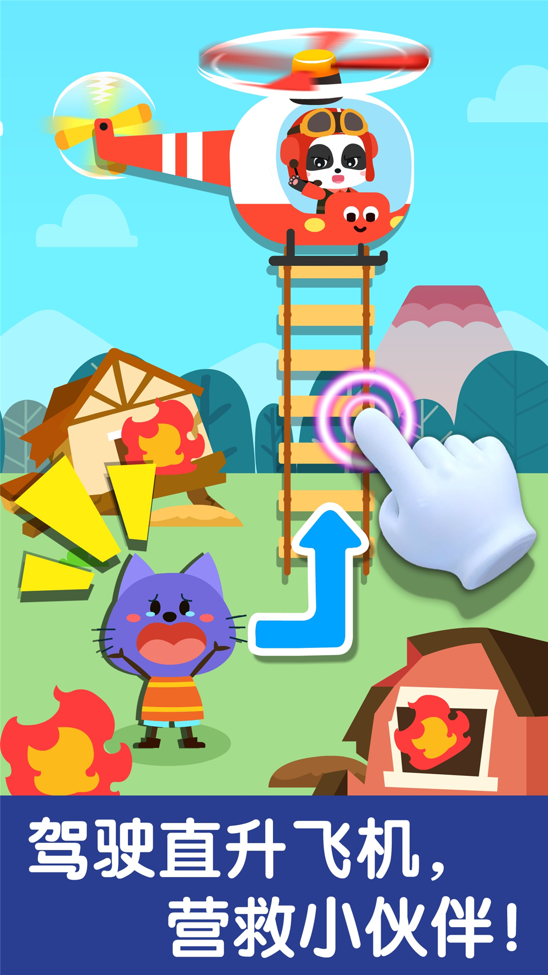 在这里宝宝能认识消防车的救援功能呢。城堡着火了,宝宝要驾驶消防车去参与灭火行动。要是有小伙伴被大火困住了,就从车上拿出消防水枪,瞄准大火冲水,哇,成功扑灭火源啦。