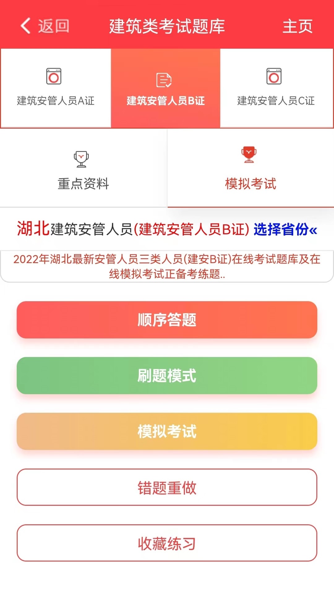 建题帮app提供多种模式练题,顺序练题、刷题模式、在线模拟考试以及错题重做等功能,可以快速帮助通过考试!