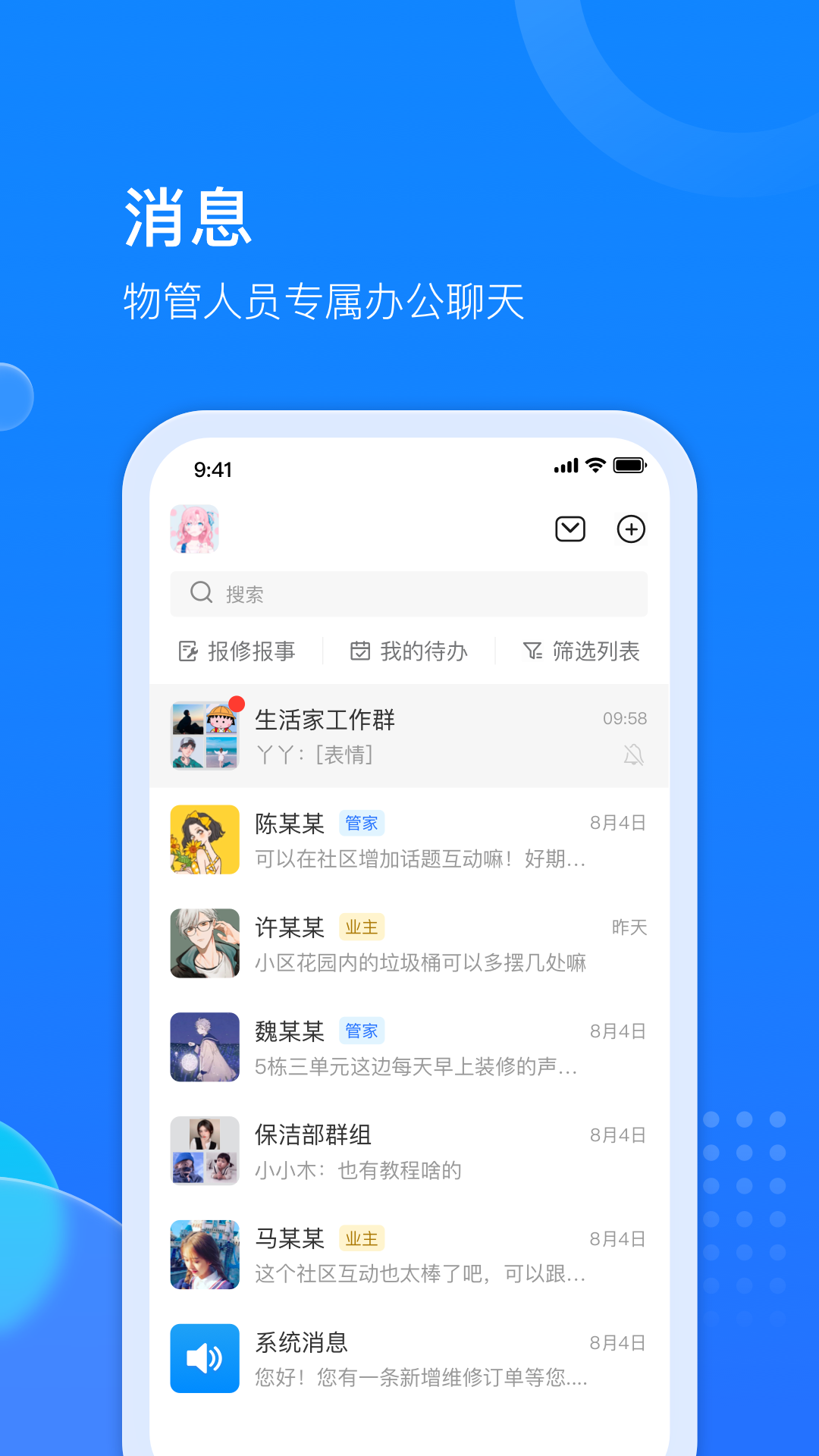 其三,办公IM协同聊天功能。物管派App能够满足物业人员在内部创建工作群或者进行私聊的需求,并且聊天内容带有水印,这能更为有效地保护工作聊天中的隐私。