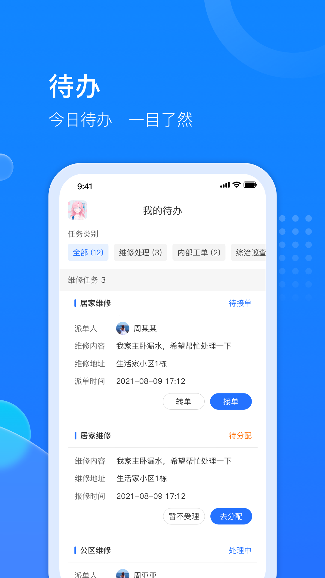 其一,线上报单报事功能。业主或者工作人员都能够在线上轻松且迅速地进行报单操作,随后在待办事项里快速处理工单。