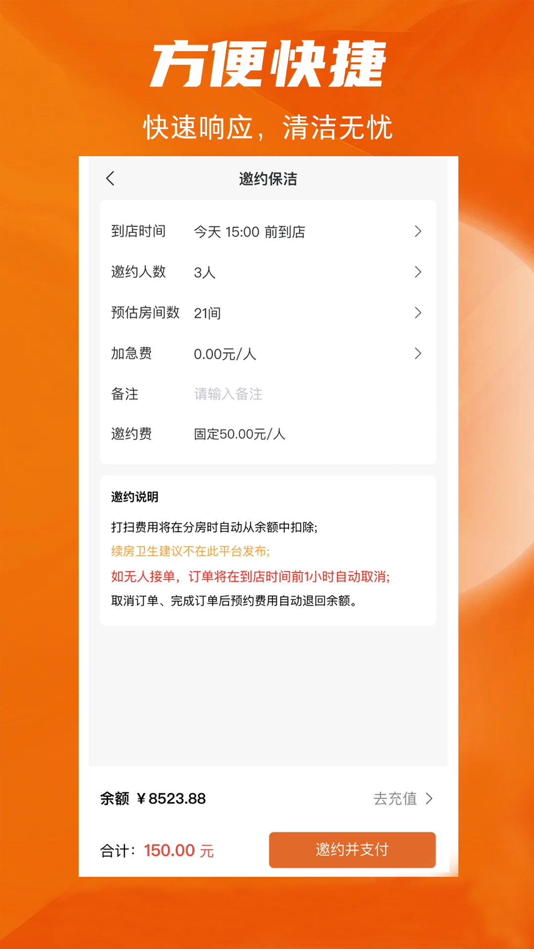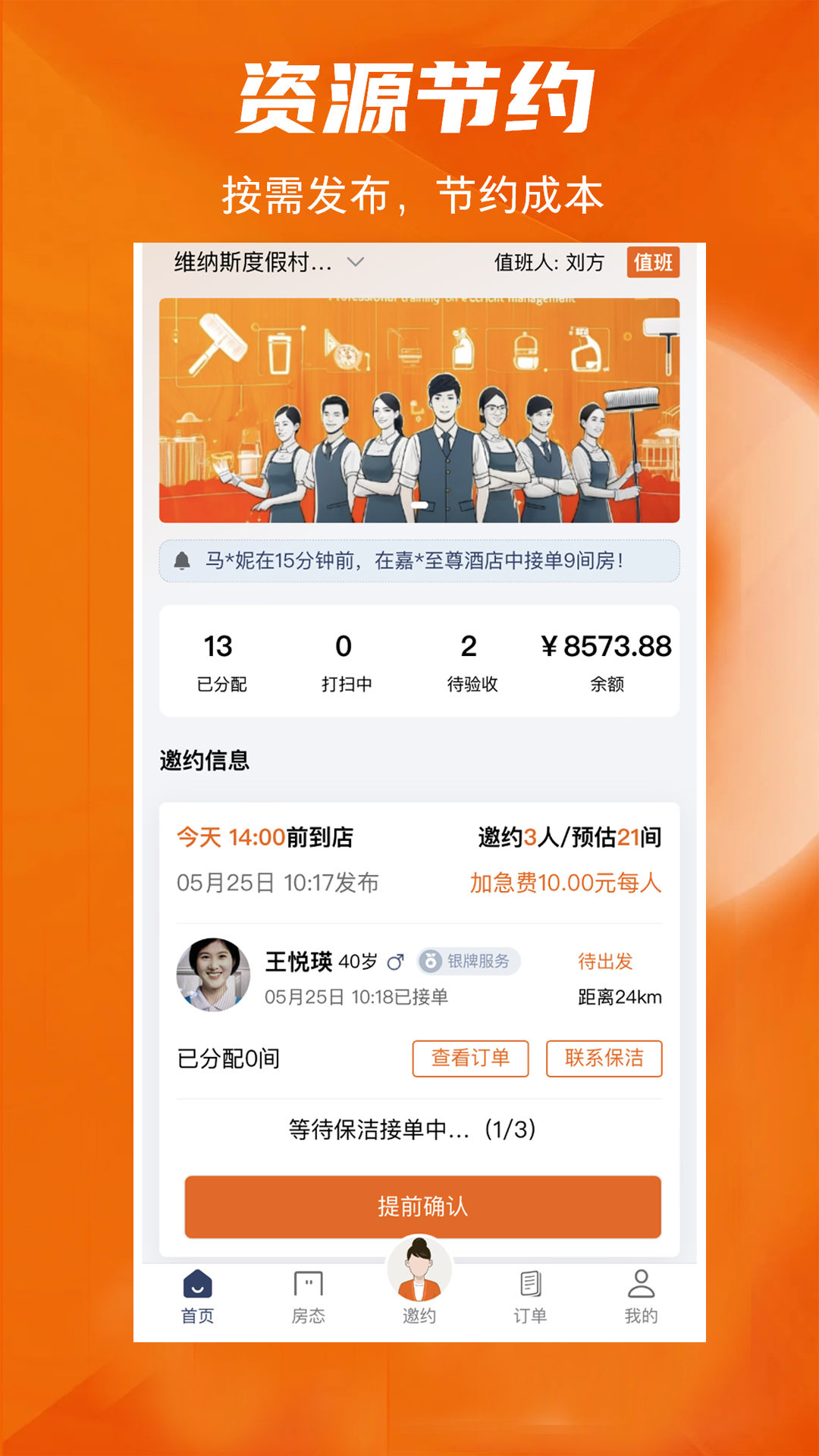 解决酒店临时性清洁需求与清洁人员资源匹配的问题。酒店工作人员可以随时在平台上发布临时性的客房清洁需求,而在附近注册并处于空闲状态的清洁人员则可以通过手机应用接单。这不仅为酒店节省了人力资源成本,同时也为清洁人员提供了灵活的工作机会。