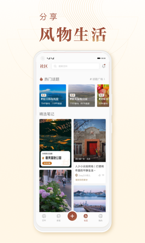 **风物社区**:大家可以一同畅谈那些可爱城市的小吃特产、难以忘怀的美丽风景、独特的非物质文化遗产技艺……记录自己的风物生活,分享每一点美好瞬间。