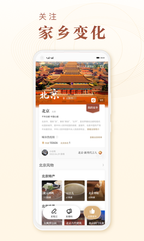 **热门城市**:这里按照城市维度来聚合风物内容,你能够在这里找到自己的家乡或者心仪的城市,为它点赞助力,使它被更多的人所知晓。