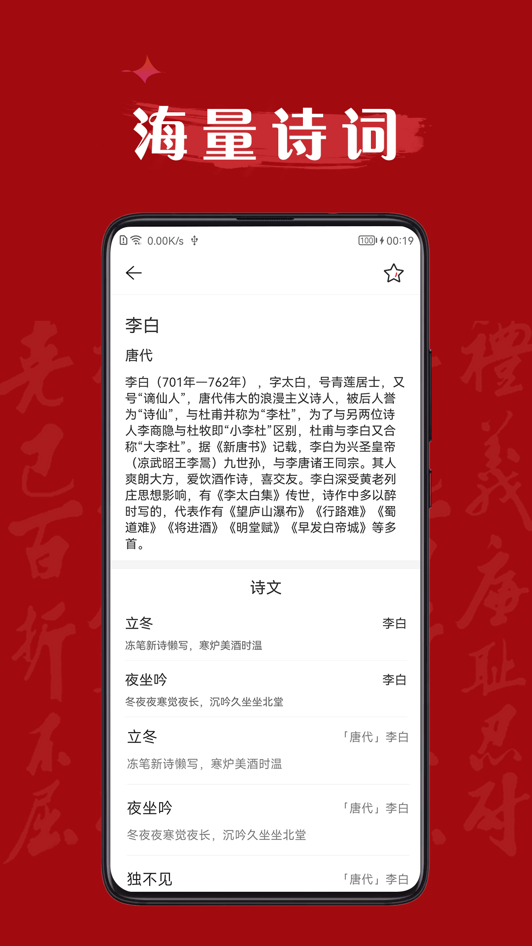 墨客古诗词为一款诗词阅读工具,汇集了从古至今大多数古人的诗词歌赋。软件致力于古典诗词文化传播,让更多的年轻人领略前人言辞的魅力。
