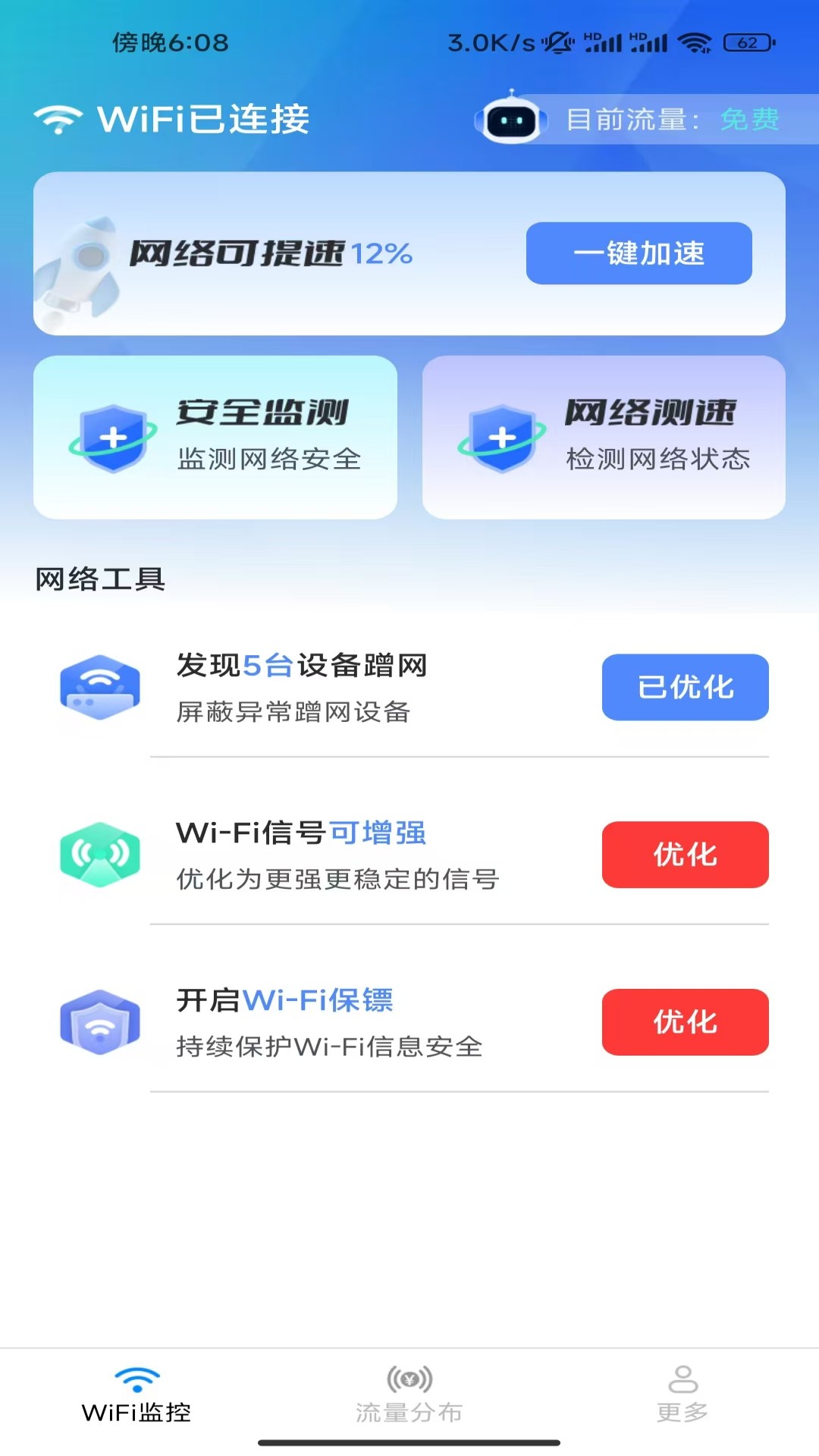 闪电WiFi钥匙是一款有网络优化、安全监测、网络测速、防蹭网优化、WiFi信号增强和WiFi保镖等多种上网实用小工具的应用。还可以监测今日和本月的流量使用数据排行榜,让你在上网更加轻松。