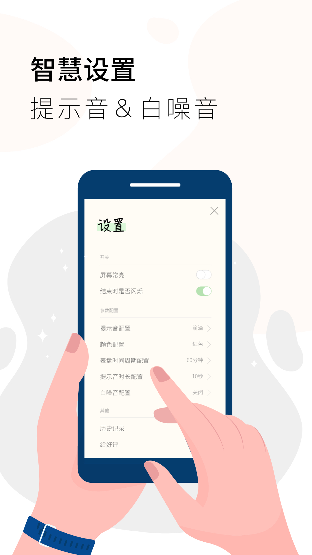 【自定义设置】使用者可对提示音、表盘颜色以及白噪音模式进行选择,满足个性化需求。