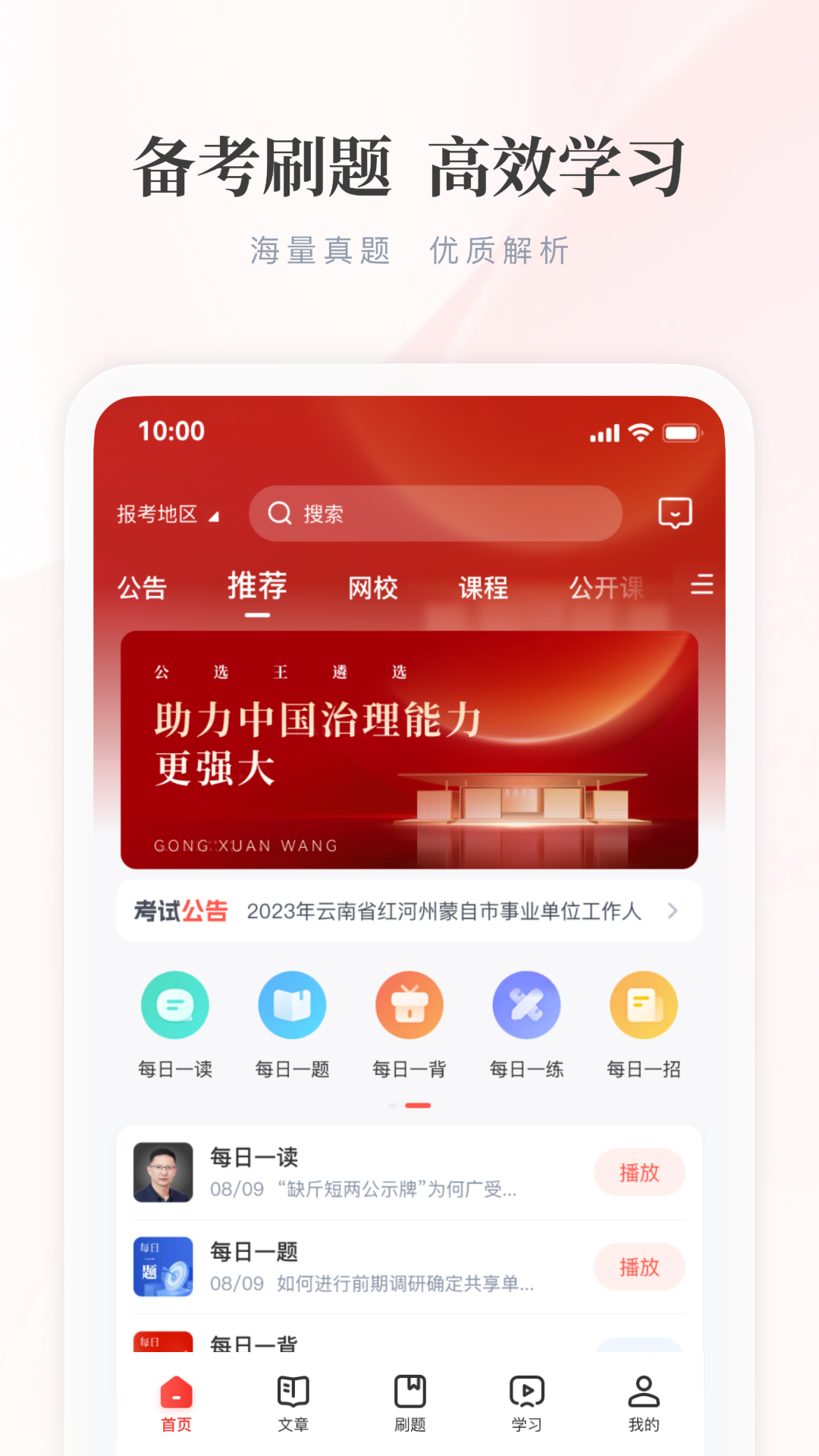 公选王精心打造了公务员遴选备考移动课堂,只要一部手机,就能让你利用碎片化的时间轻松获取各地新发布的遴选考试资讯,还有历年遴选考题。你可以在这里进行实战化的遴选考试模拟,学习遴选笔试和面试课程,公选王将为考生提供一站式个性化的培训服务。