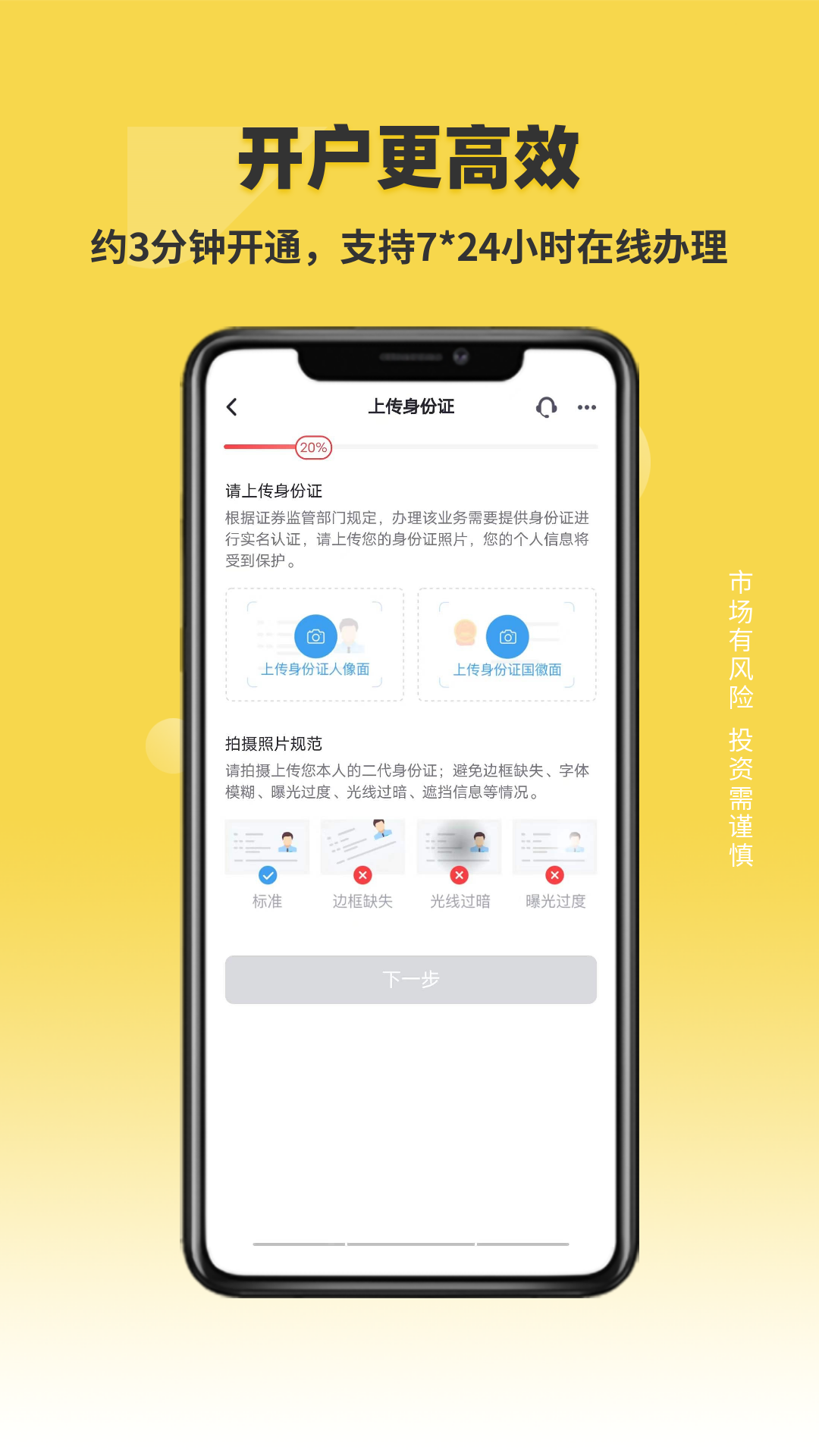 2、开户更高效:单双向视频见证任君选择,3分钟极速开户,支持7*24小时全天候办理。
