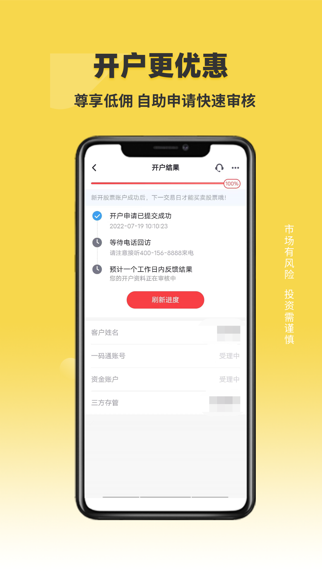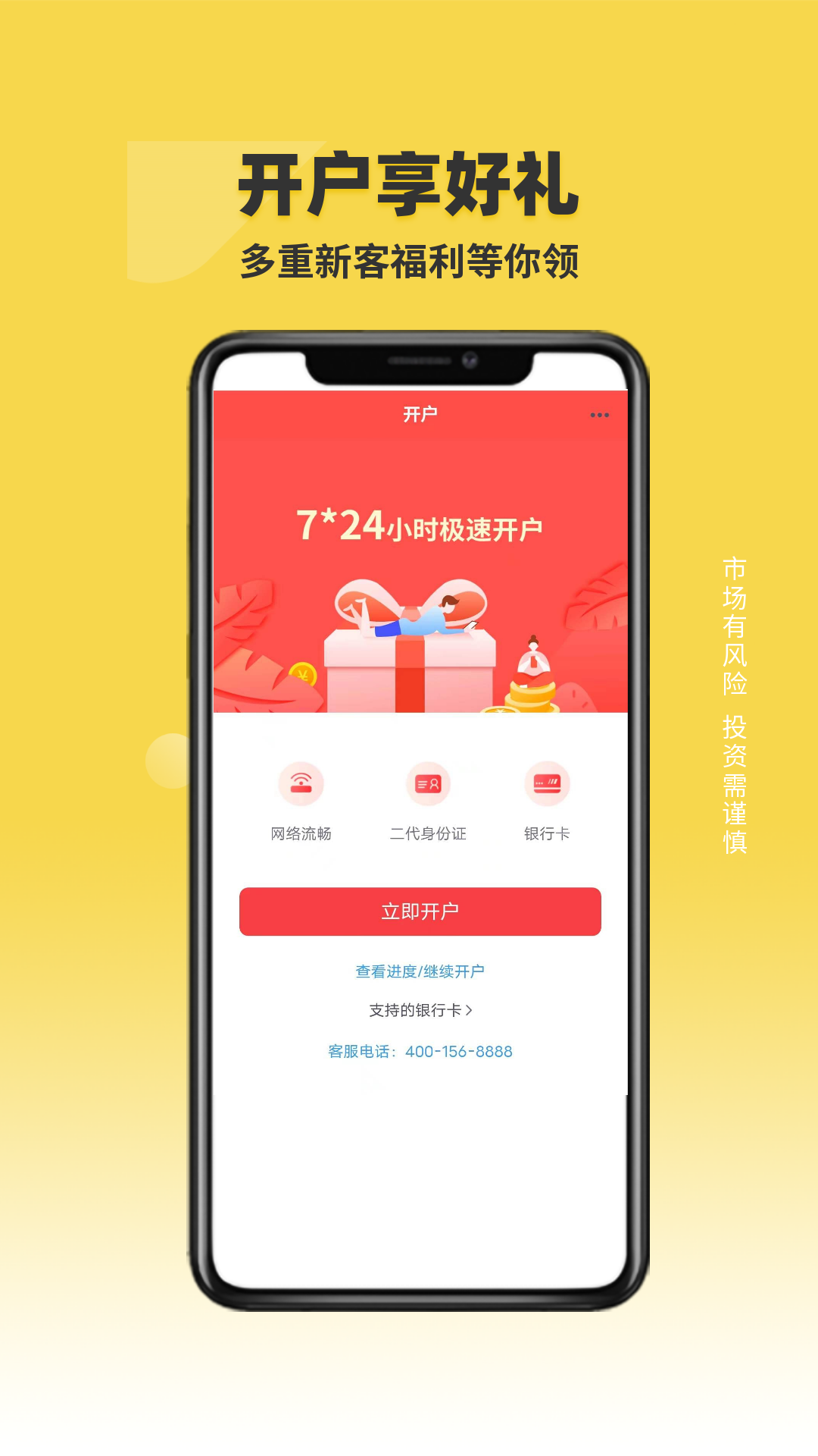3、开户更省心:沪深A股账户、基金账户,一次操作全部开通,免去重复操作,省时又省心。