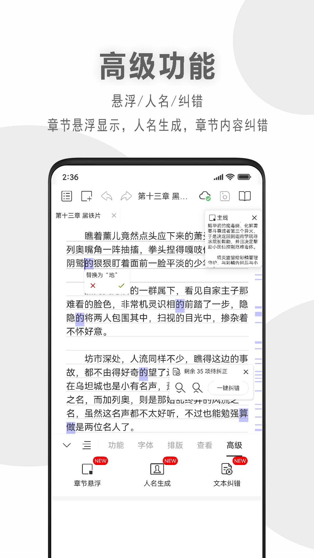 其四,高级功能十分贴心。章节可悬浮显示,能够生成人名,还能对章节内容进行纠错,让创作变得更加轻松。