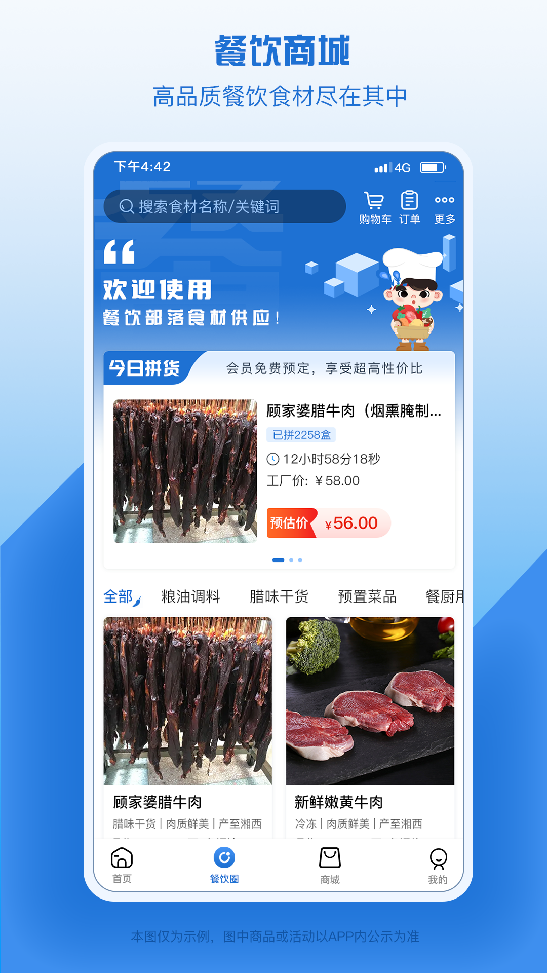 餐饮店铺转让信息、餐饮行业资讯等;线下场景服务包括食材共享博览展厅、共享业务洽谈室、共享中央厨房、共