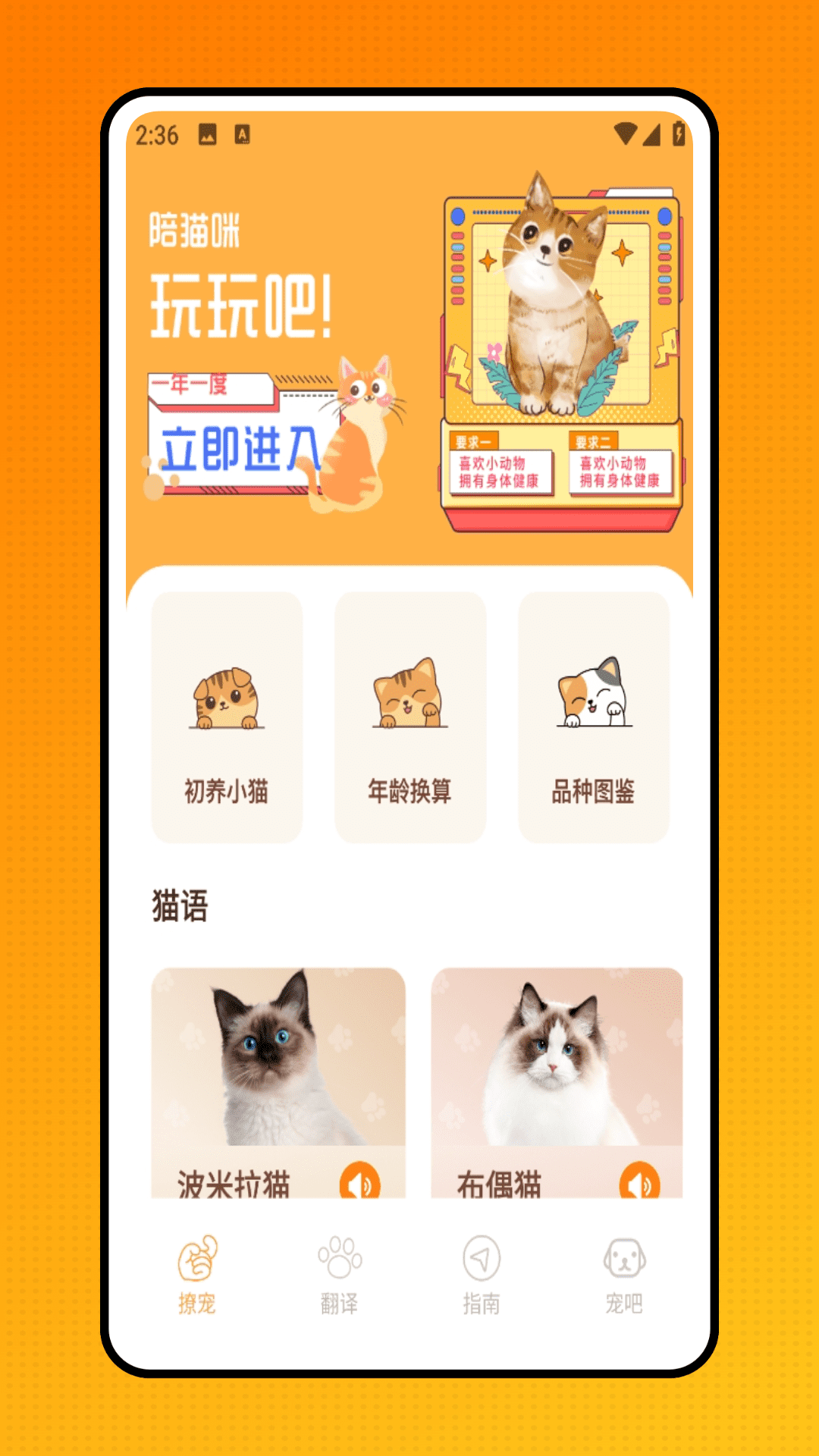 这里会展示众多不同品种猫的猫语,例如波米拉猫、布偶猫、赤猞猁、沙特尔猫、挪威森林猫等。通过各种各样的声音去吸引猫咪,还能迅速对猫语进行翻译,如此我们就能了解猫咪是高兴还是有其他需求,像是饿了、想打架、表达友好、非常生气、抗拒或者咆哮等情况,进而更好地实现人与猫狗的沟通交流。