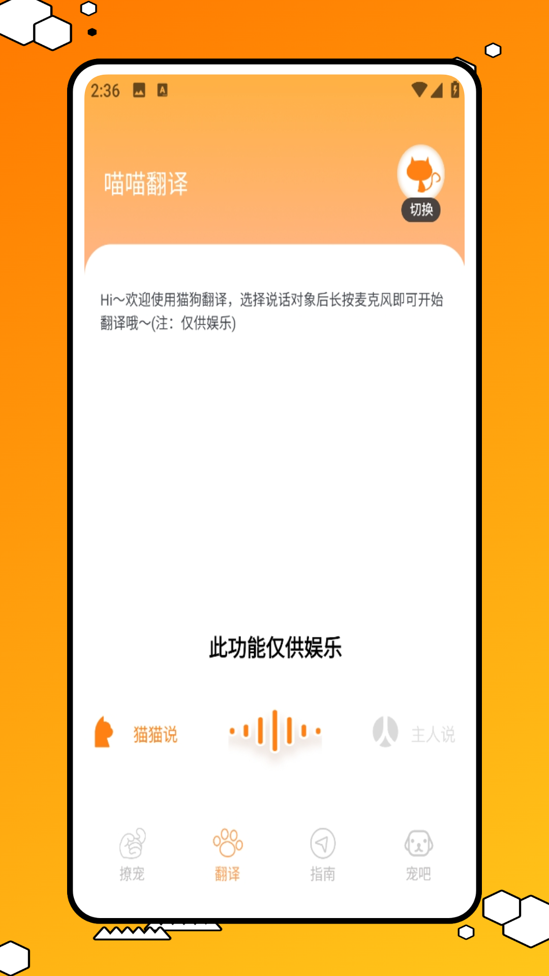 只要按住语音键,直接说出语音内容,就能将其翻译为猫狗能够听懂的语言,这大大提升了人与猫狗交流的效果,增加了逗弄猫狗的乐趣,当然,这个功能仅仅是用于娱乐目的。