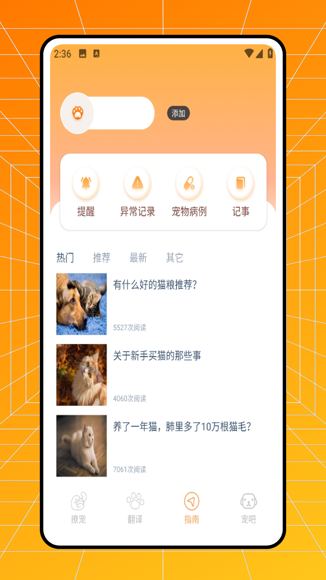 这里会分享各种各样养猫和养狗的技巧,从新手养猫狗开始,包括猫狗的食物选择,各个成长阶段的注意要点,还能对猫狗的各项情况进行记录,就像记事一样方便。