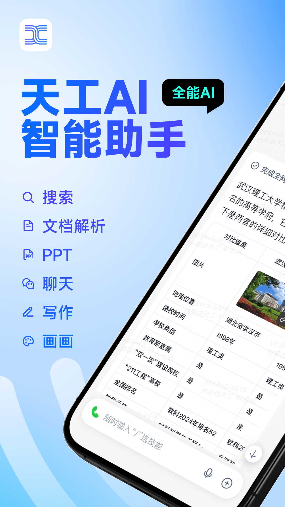 天工app是一款全能型AI助手,集搜索、写作、文档分析、多模态生成为一体。它可为用户随时提供多种智能服务,像是全网搜索、AI PPT、文件解读、文本创作、代码编程以及AI画画等,真正让AI融入生活!