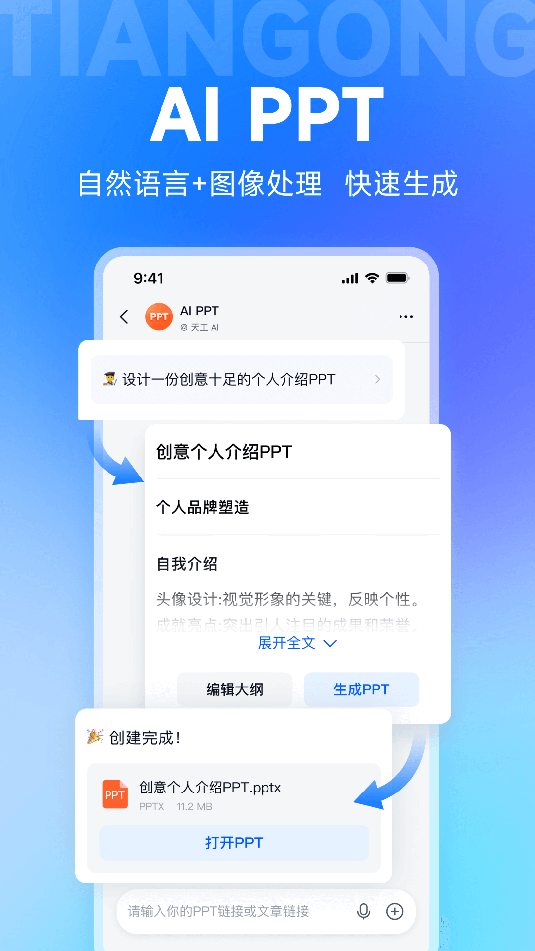 天工AI拥有强大的PPT制作能力。用户只需输入需求,它就能生成可在线编辑的PPT大纲,还能检索到契合PPT需求的图片,或者自动生成匹配的图片素材,最后匹配合适的PPT模板。同时,AI PPT支持个性化定制,也支持多格式下载。