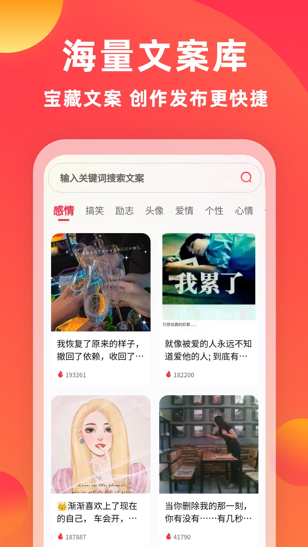我们有10000 +的唯美文案,利用文案工具,只需在搜索栏输入关键词,就能获取大量热点文案,帮助你打造吸引人的内容。