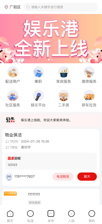 在这个APP上,您能享受到多种同城服务。如果您家中有需要维修的地方,这里提供同城家政维修服务,轻松解决您生活中的各种维修困扰;它具备娱乐平台在线论坛功能,让您可以在论坛里畅所欲言,分享生活乐趣、交流娱乐心得等;如果您有二手房相关的需求,无论是查看二手房信息,还是发布自己的房源信息,在这里都能便捷实现;这里还有配送服务,满足您日常生活中的购物配送等需求;当您需要拉货或者拼车出行时,拼车拉货服务能为您提供方便;同时,工作招聘服务也涵盖其中,为求职者和招聘方搭建了一个高效的对接平台。