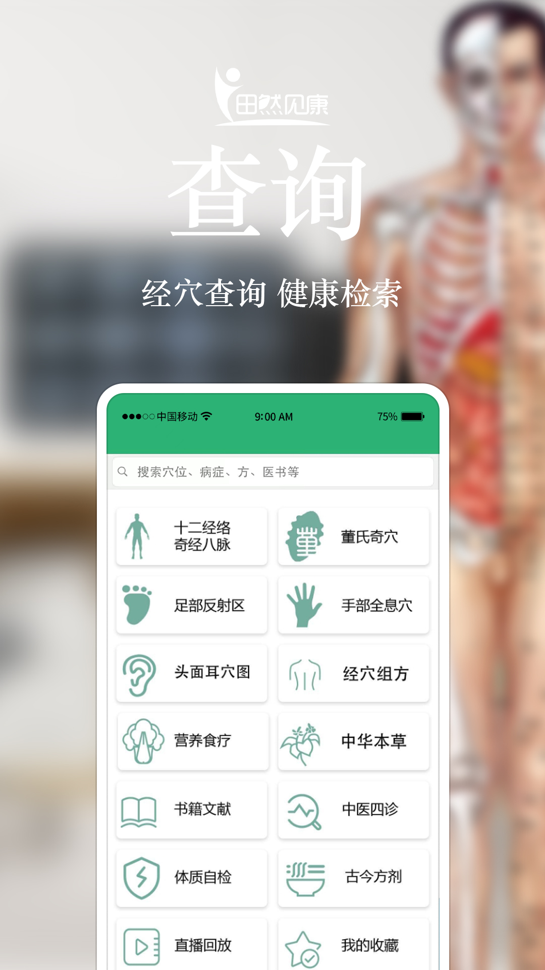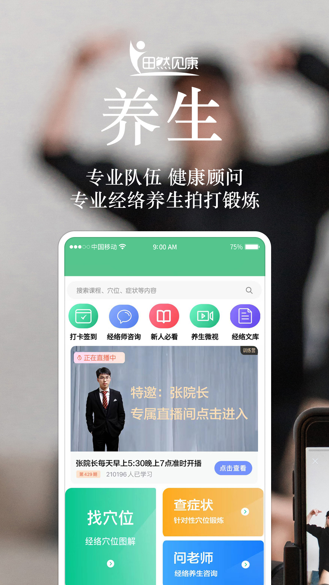 我们每天还有专业的健康管理师、营养师带领家人们进行中医健康养生经络运动锻炼。在这个APP里,还配备了丰富的经络穴位查询工具,并且有田然自营的各类滋补食品,全方位地从身、心、灵等各个方面为您的健康保驾护航。