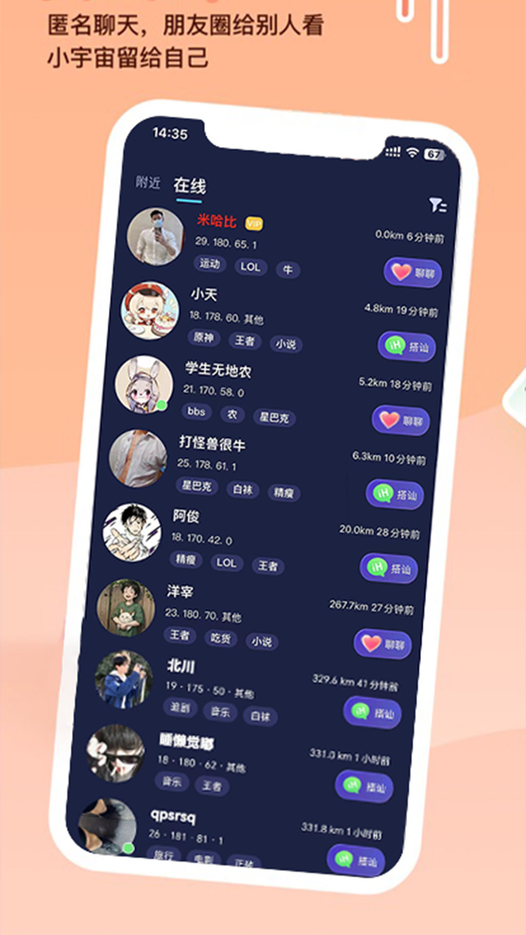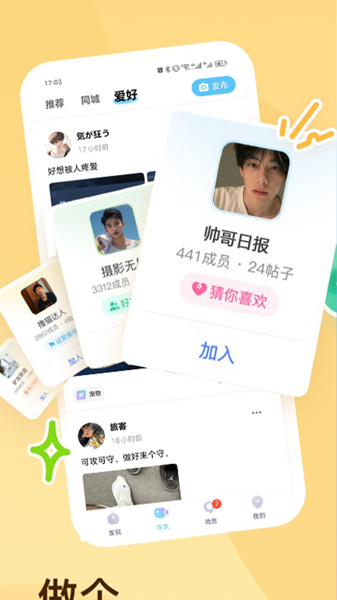 与他,是一款基于兴趣爱好开展交友活动的社交软件。在与他这个平台上,用户能够尽情分享自己的精彩生活点滴。于此同时,还可以轻松发现周边的好友,查看他们发布的动态以及可公开的资料信息。并且,软件会依据用户的兴趣爱好,进行多维度的匹配操作,为用户找到志同道合的朋友提供便利。
