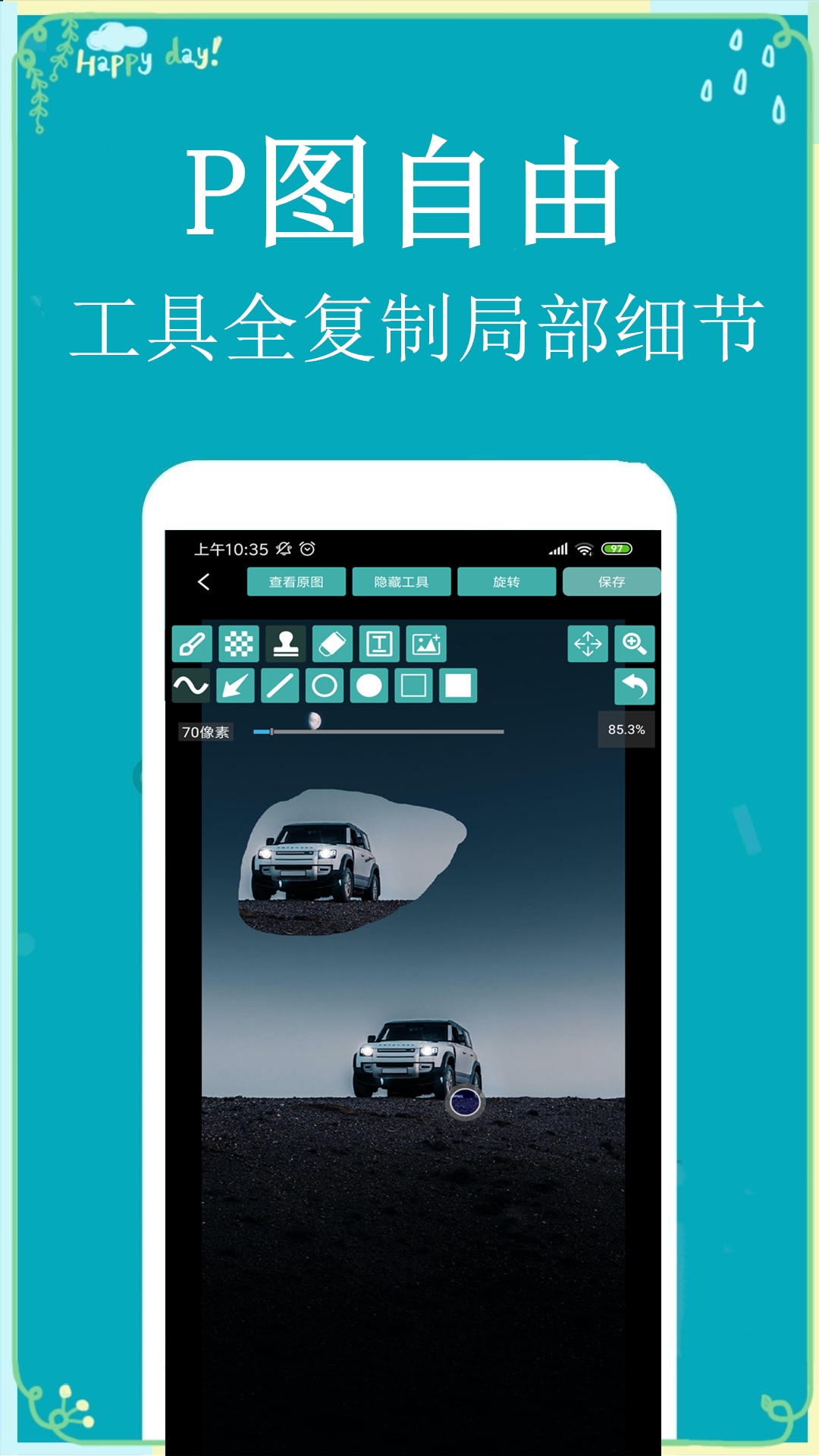 保存及分享:制作好满意的图片后,你可以快速方便地将效果图片保存到手机相册,或者分享到任何你想要分享的APP。