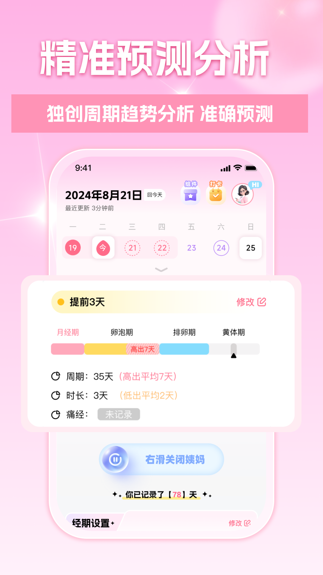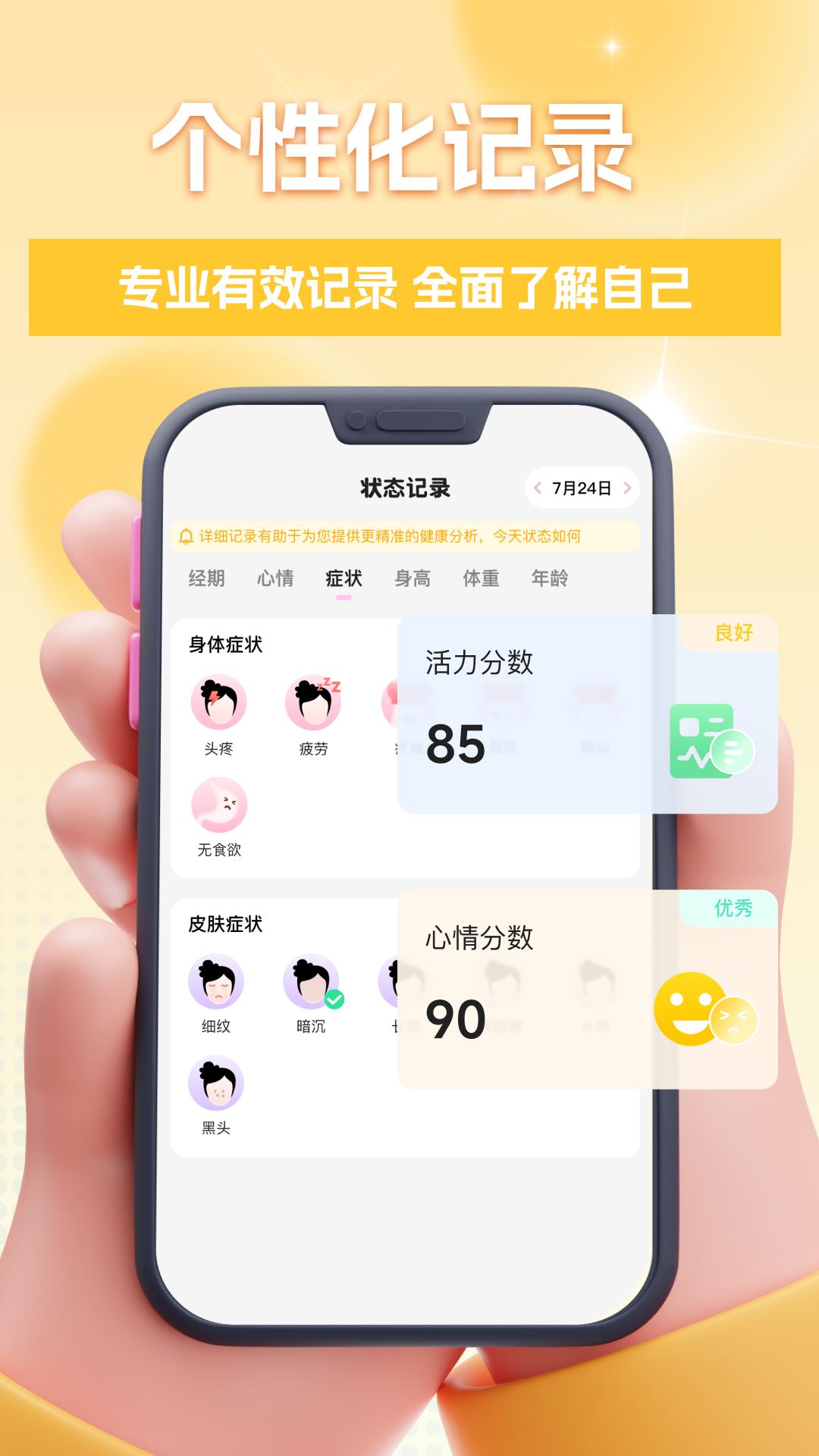 它功能十分强大,包含众多实用功能。在经期管理方面,有经期记录功能,能够让女性查看每月生理期的时间以及周期,从而更好地了解自己的身体状况与健康情况;还有根据以往姨妈日期记录,来推算安全期、生理期、经期的【姨妈助手】功能,并且可以预测下一次的月经期时间,这一【经期提醒】功能能够避免突然来月经时的窘迫,让女性提前做好准备,心里更踏实。其【日历标记】功能会在日历上标注经期日子,采用彩色高亮显示,十分醒目,同时日历还可用来记录心情日记。