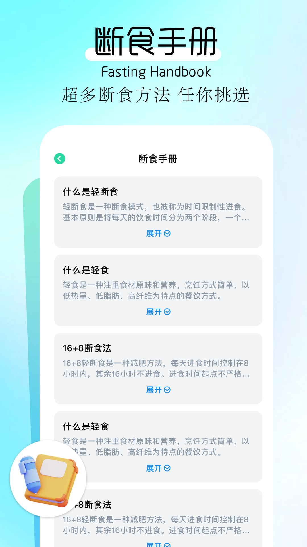 另外,它的断食手册能让用户全方位地了解轻断食和轻食概念,以便根据自身需求与状况,选择适合自己的断食方式。