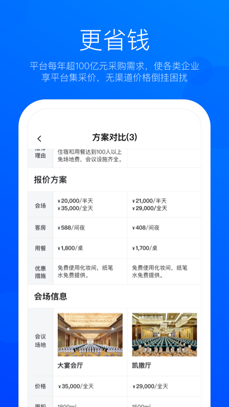 Eventbest凭借会小二平台已经商用六年、面向社会数十万家企业用户的会议采购网络,不仅提供多达2万家的酒店资源以及7万家特色场地,而且还为办会人员构建了能够实时响应的报价网络,只需10 - 30分钟就能获取酒店销售提供的实时档期与竞标价格。