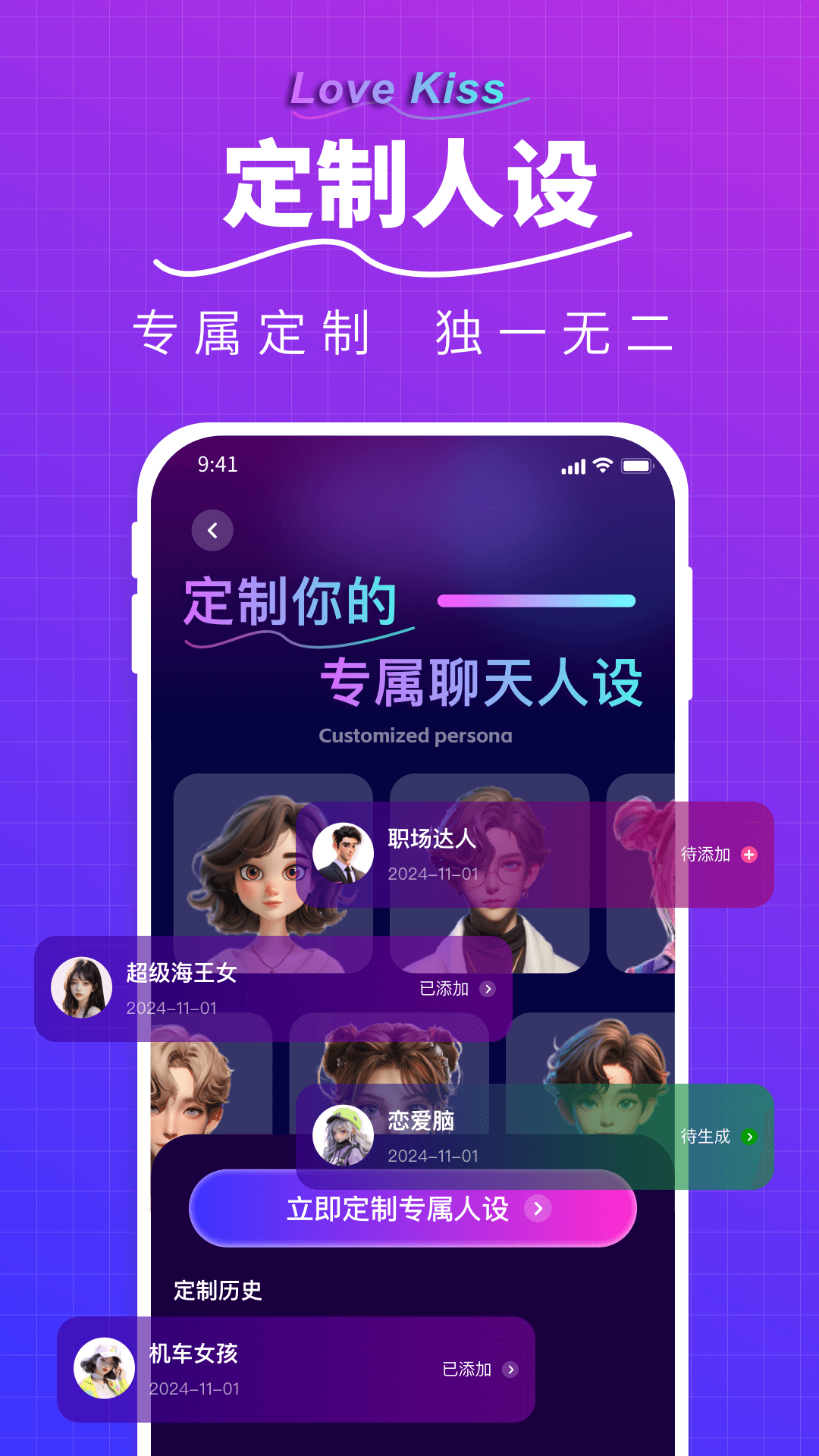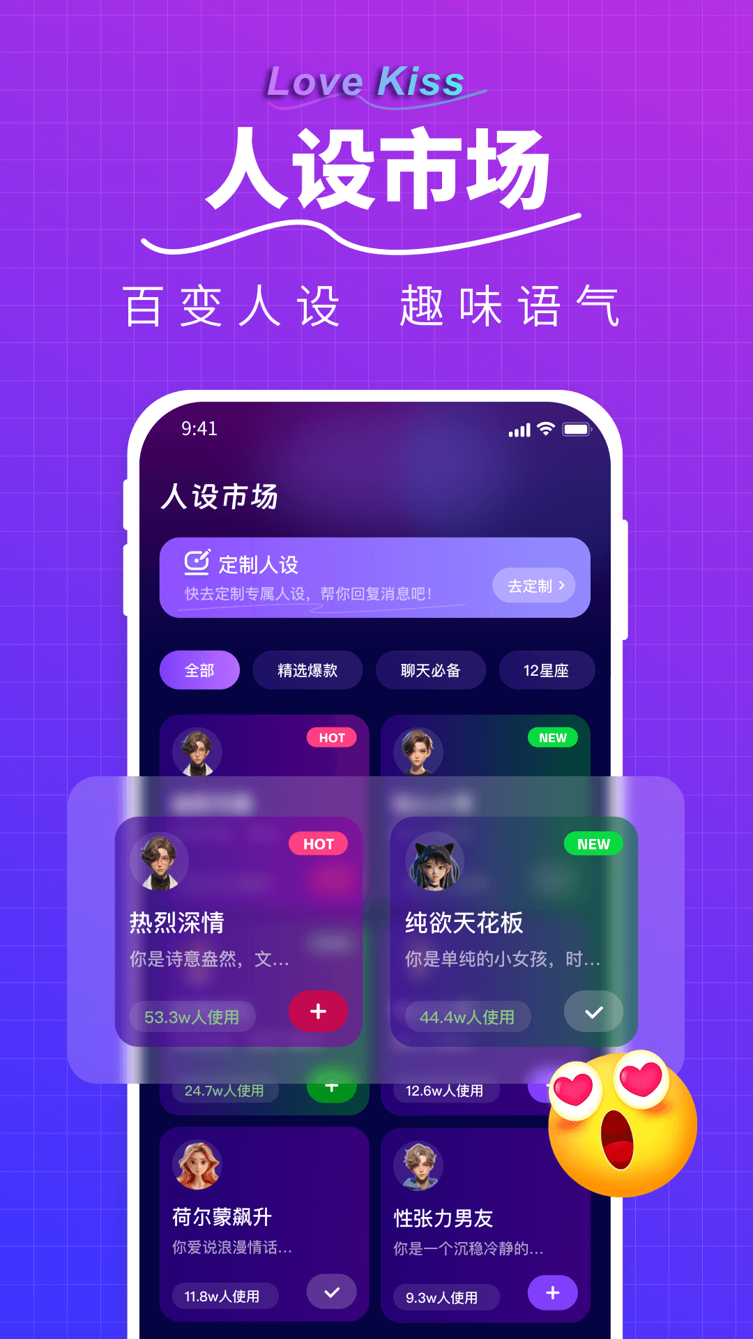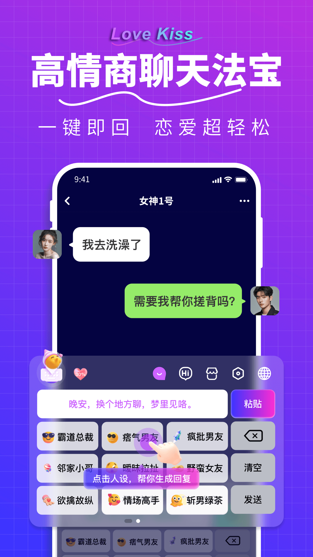 LoveKiss输入法是一款专门面向恋爱初学者以及被恋爱困惑所扰的人群而打造的恋爱聊天话术应用。它能够为你定制专属人设,让你在回复消息时更加轻松自如。