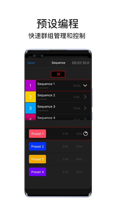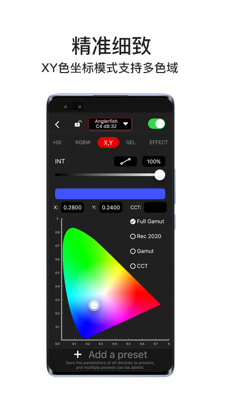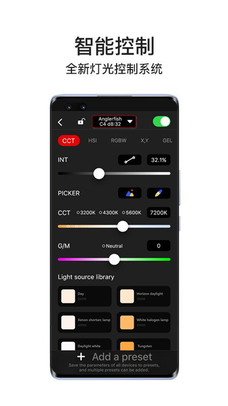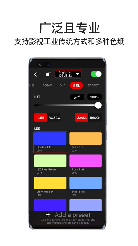 Lumin+是一款能够与灯光产品配套使用的App,它可使移动设备直接连接多台灯光设备并对其进行控制。在Lumin+中集成了专业灯光领域里既专业又齐全的控制功能与模式,其中包含色温模式、HSI模式、RGBW模式、XY色坐标、GEL色纸、特效模式、音韵模式以及灯光预设功能等。该App以简洁、便捷的操作方式,助力摄影师在不同场景下迅速完成灯光的布置与控制工作。