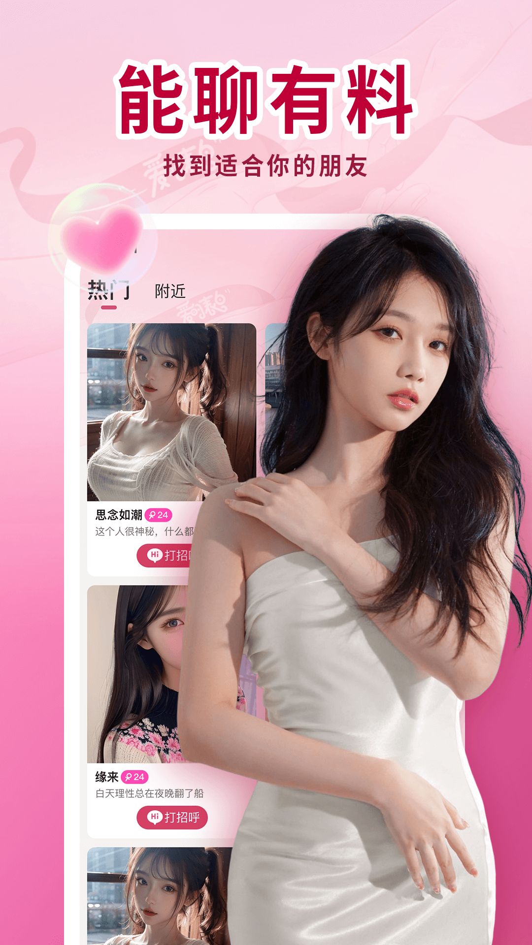 【海量用户】这里有软萌可爱的妹子、温柔知性的小姐姐、善解人意的大姑娘等。有着海量真实的单身妹子,是高质量人群约会的集中地,能够一对一甜蜜私聊,开启美妙的邂逅之旅。