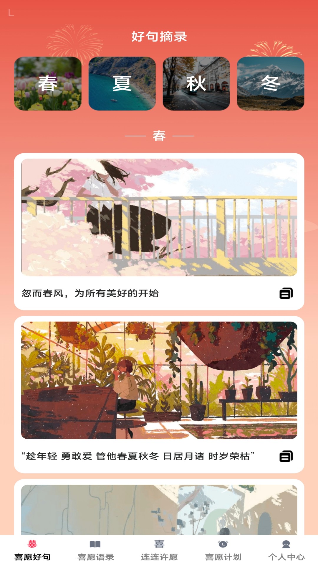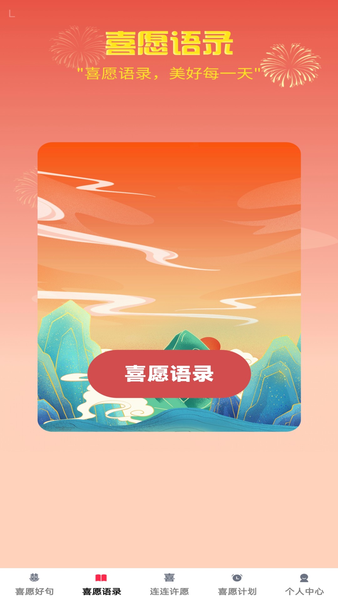 喜愿连连是一款专注于记录美好心愿和激励语录的应用,通过好句摘录、励志语录、许愿和制定愿望计划,陪伴您实现心中的梦想,让每一个心愿都有可能实现。喜愿连连,愿您的每一天都充满希望与幸福。