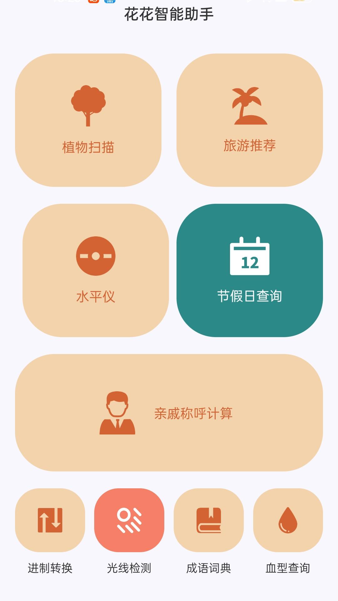 这款多功能应用集合了植物扫描、旅游推荐、水平仪、节假日查询、亲戚称呼计算、进制转换、光线检测、成语词典和血型查询等实用功能。无论您是想了解周围的植物、规划旅行、测量水平、查询节假日、计算亲戚称呼、进行进制转换、检测光线强度、查找成语释义还是了解血型信息,这款应用都能满足您的需求。让花花智能助手成为您生活中的得力助手,为您提供便捷、全面的智能服务!